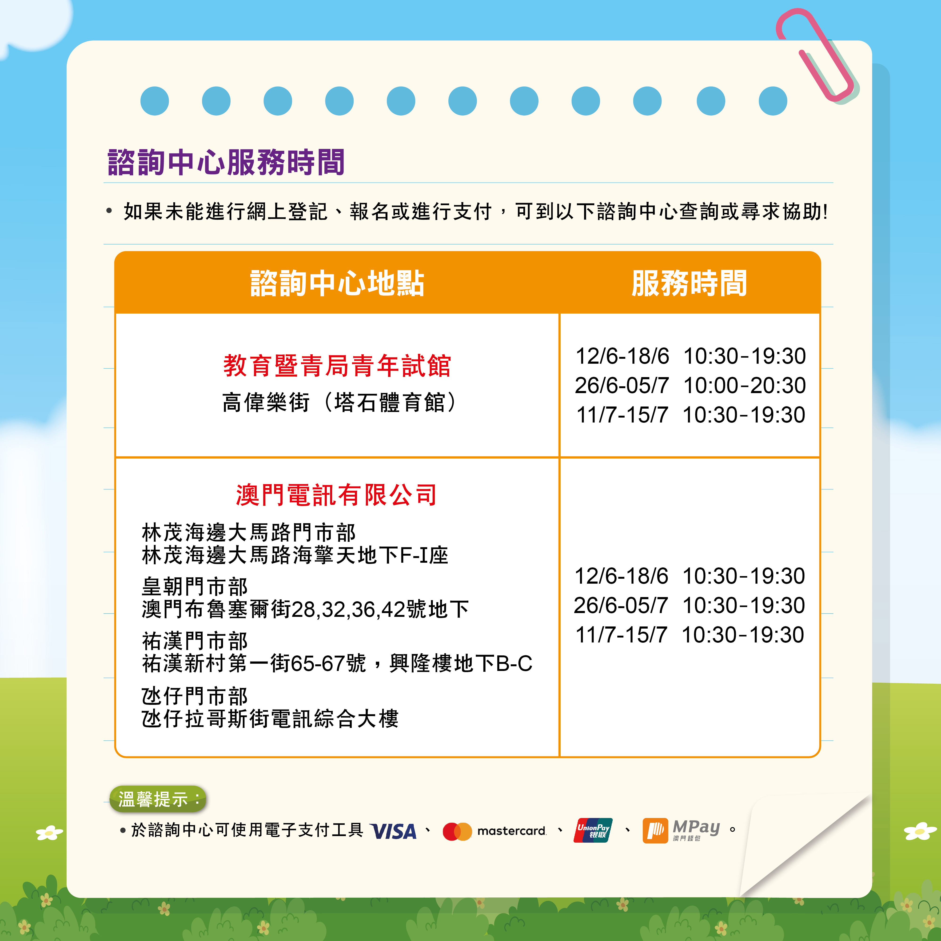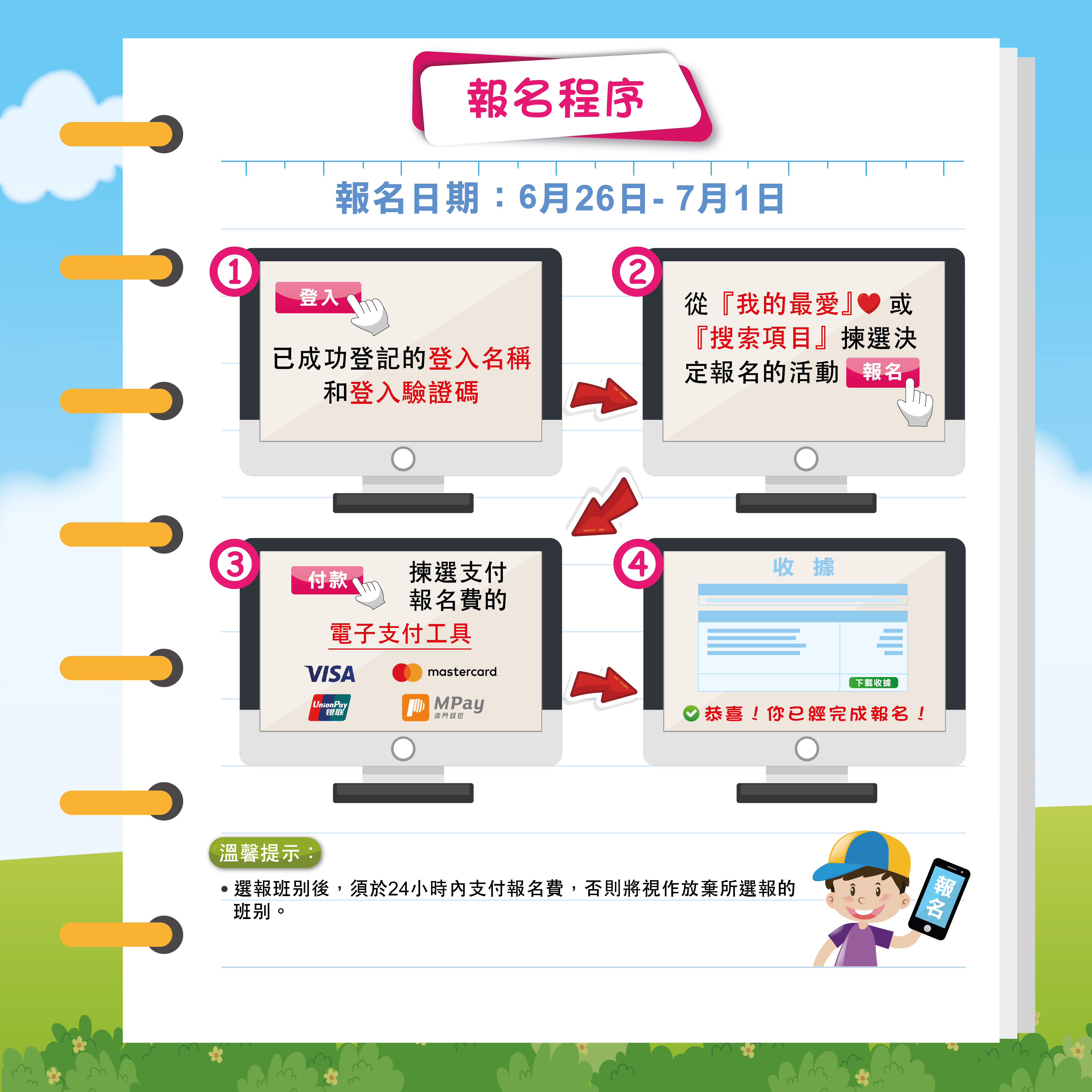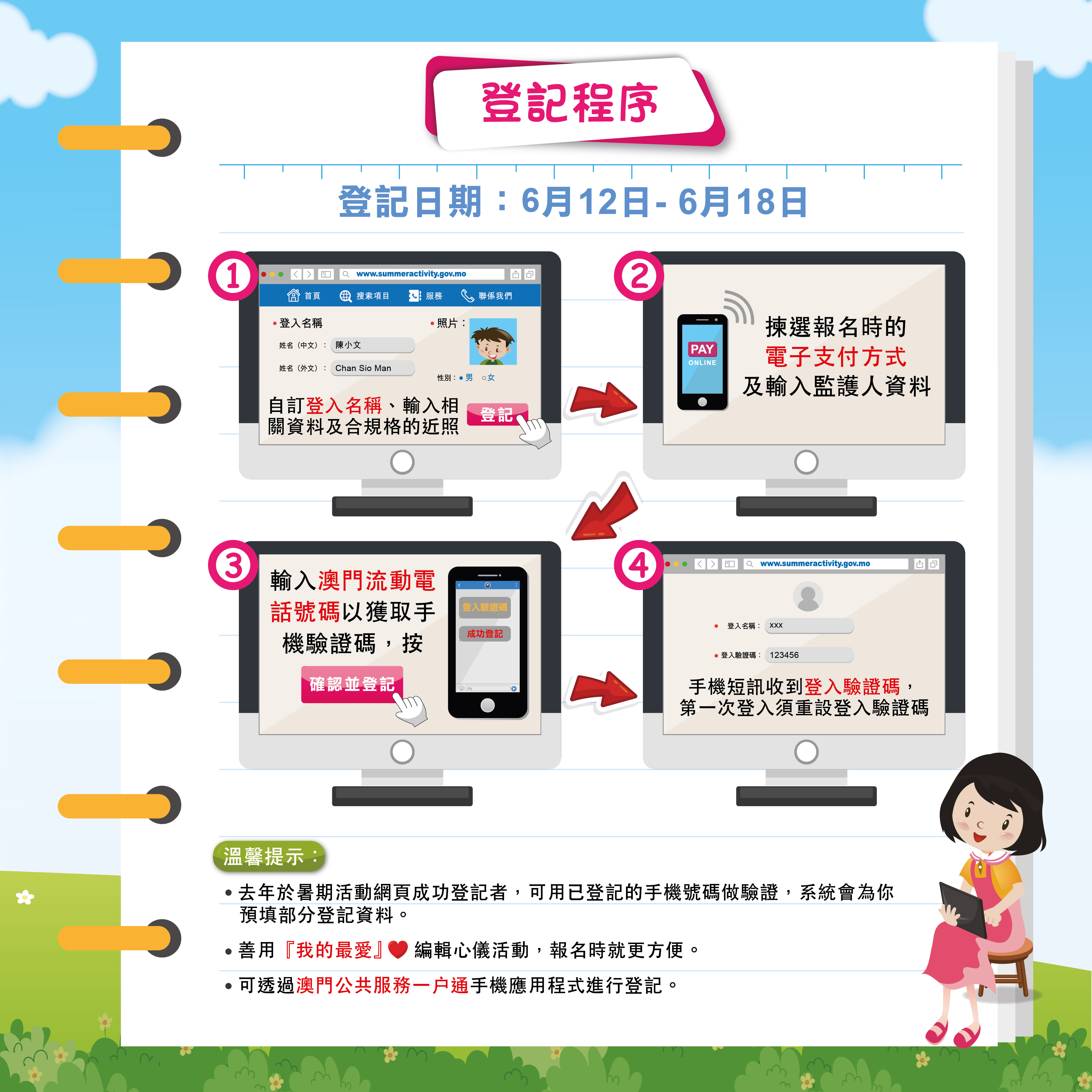 爲了讓市民瞭解網上報名流程,主辦單位將分別於6月12日在青年試館及6月13日在氹仔教育活動中心舉辦網上報名講解會(講解會報名連結www.summeractivity.gov.mo/sasmember/signup)。