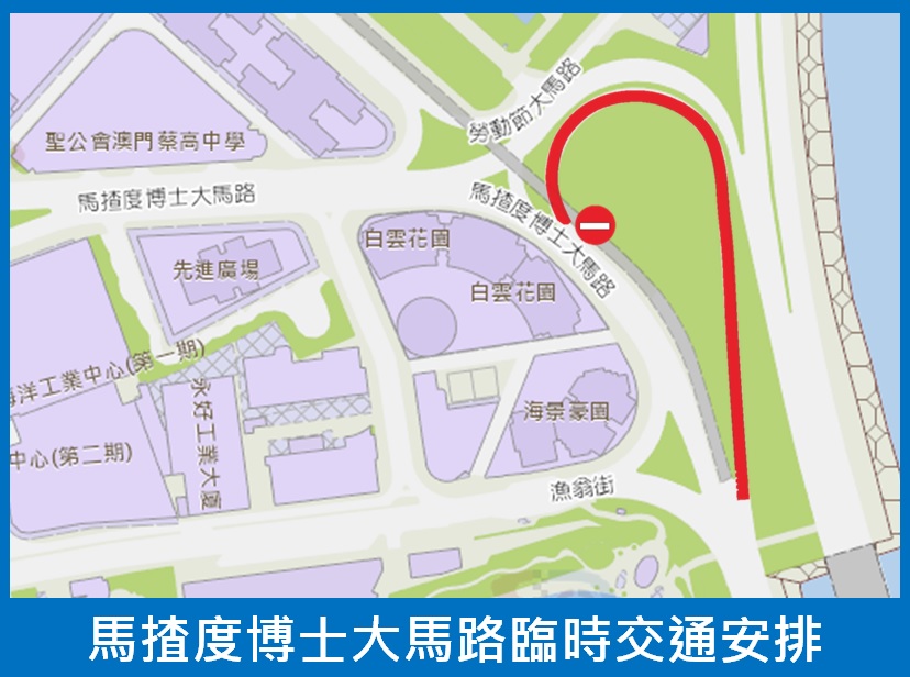 6月23日(周二)上午9時30分至下午4時30分馬揸度博士大馬路右轉入友誼大馬路的中央調頭車道臨時封閉,以配合市政署修剪樹枝。