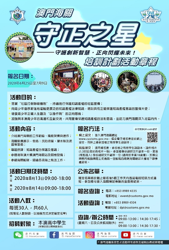 為向青少年灌輸更廣泛的知識產權法律知識,培養青少年正確人生觀及對社會的責任感。澳門海關將開展“守正之星”培訓計劃,招募對象為本澳高中學生,報名日期由6月25日至7月9日,歡迎踴躍參與。