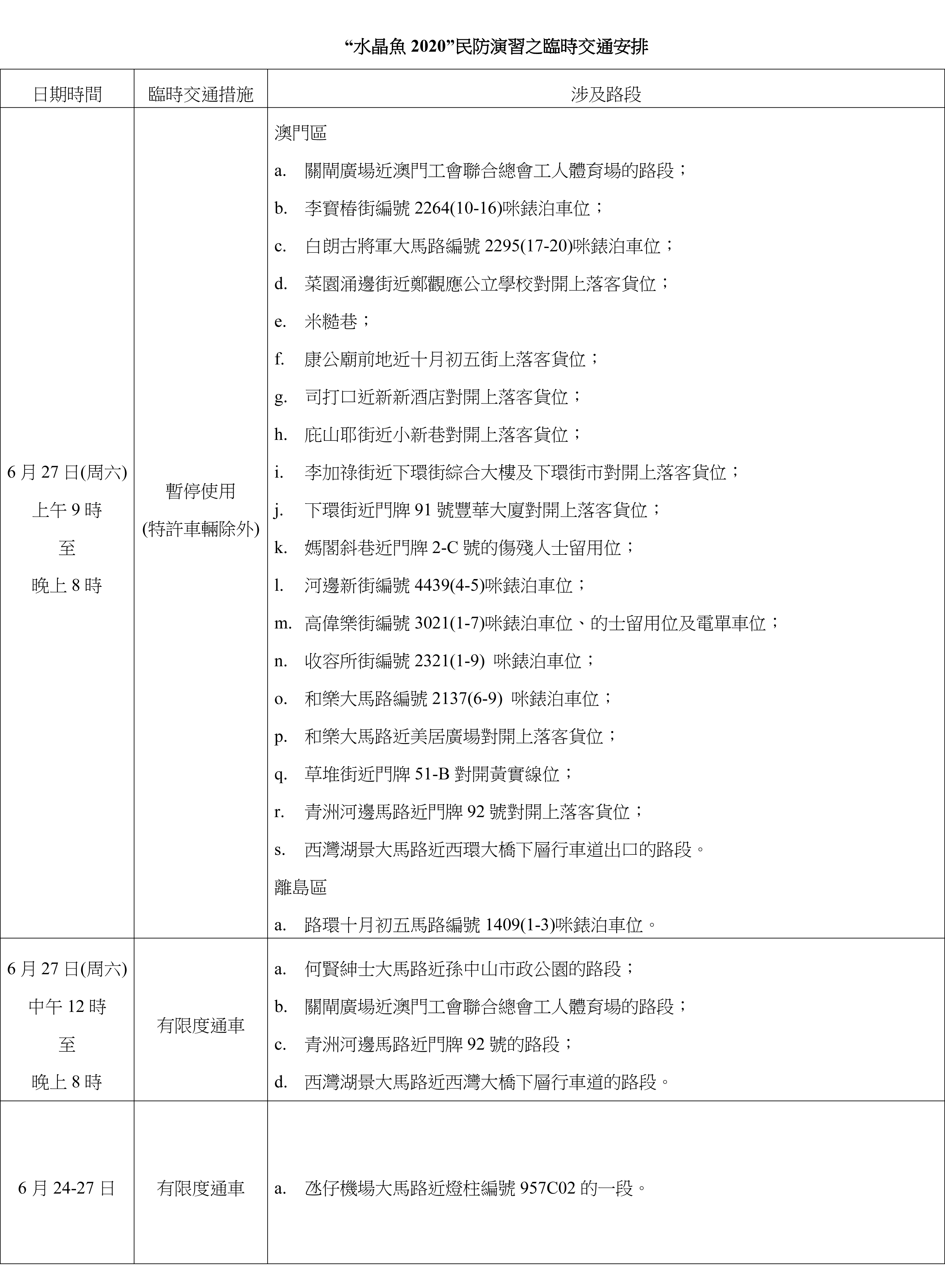演習將在青洲區、筷子基區、內港區、下環區及路環區五個區域舉行,屆時部份路段、上落客貨區、咪錶及汽車泊位將暫停使用(如圖示)。治安警察局會派員在相關區域維持交通和公共秩序,讓參與演習的車輛和人員能迅速有序到達指定的避險中心和集合點,以盡量減少對區內民和旅客出行造成的影響。在此呼籲公眾及駕駛者需留意相關措施,並聽從演習現場人員的指示有序行進。
