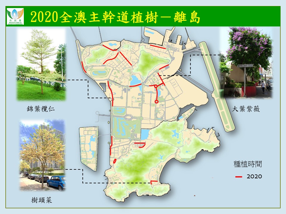 二零二零年主幹道植樹計劃現已有序展開,計劃共種植約一千八百株樹,已種植地點包括望德聖母灣大馬路、霍英東博士大馬路,體育館大馬路及廣東大馬路等。下半年將繼續在馬度博士大馬路、四月二十五日前地、馬場北大馬路至友誼橋大馬路、孫逸仙大馬路及休憩區、氹仔輕軌沿線、北安大馬路至偉龍馬路、機場大馬路、體育館大馬路、蓮花海濱大馬路、黑沙馬路、賈梅士大馬路及石排灣公屋群周邊道路種植樹木。