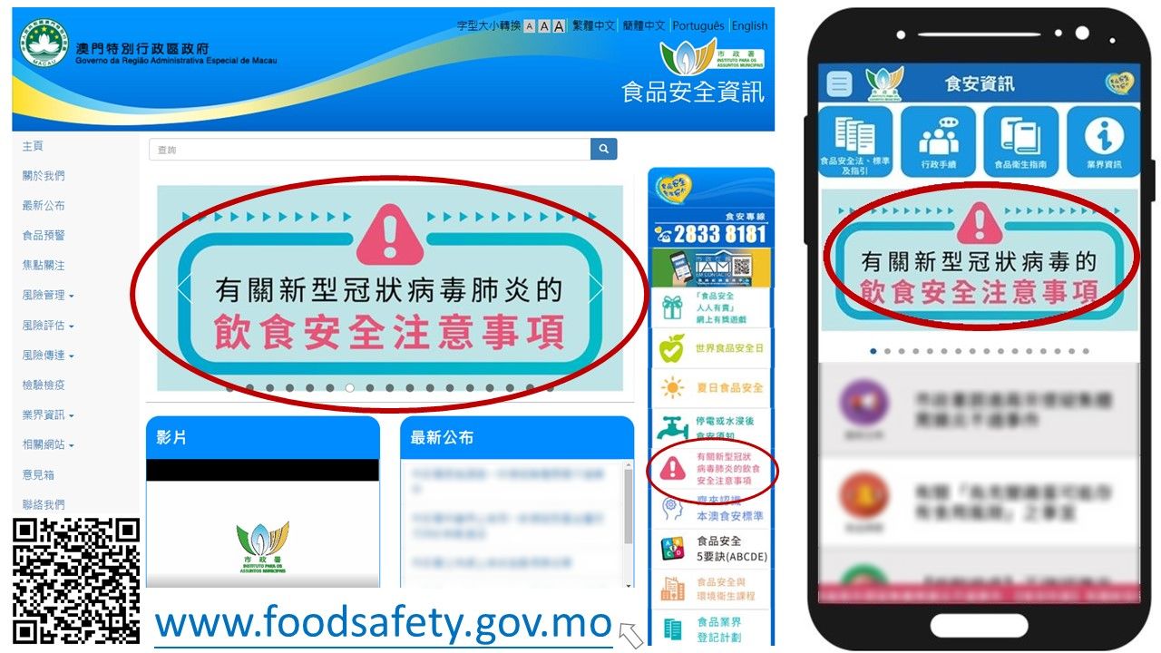 基於食品安全及衛生防護,市政署於食品安全資訊網 www.foodsafety.gov.mo 設有「有關新型冠狀病毒的飲食安全注意事項」專頁,提供一系列指引及宣教內容,包括針對食品業界發出的《預防新型冠狀病毒肺炎的食品安全衛生指引》等,更就一些新型冠狀病毒與食品安全的謠言與謬誤,作出闢謠和詳細解說。更為社服團體及教育機構提供「有關新型冠狀病毒肺炎的飲食安全注意事項」主題講座,助市民正確認識及解讀新冠肺炎疫情下的食品安全風險,避免誤信謠言而引起恐慌。公眾可登入食安網或下載「食安資訊」手機應用程式,掌握準確資訊,在有序地恢復日常生活的同時,能科學且理性地助力防疫抗疫常態化發展。