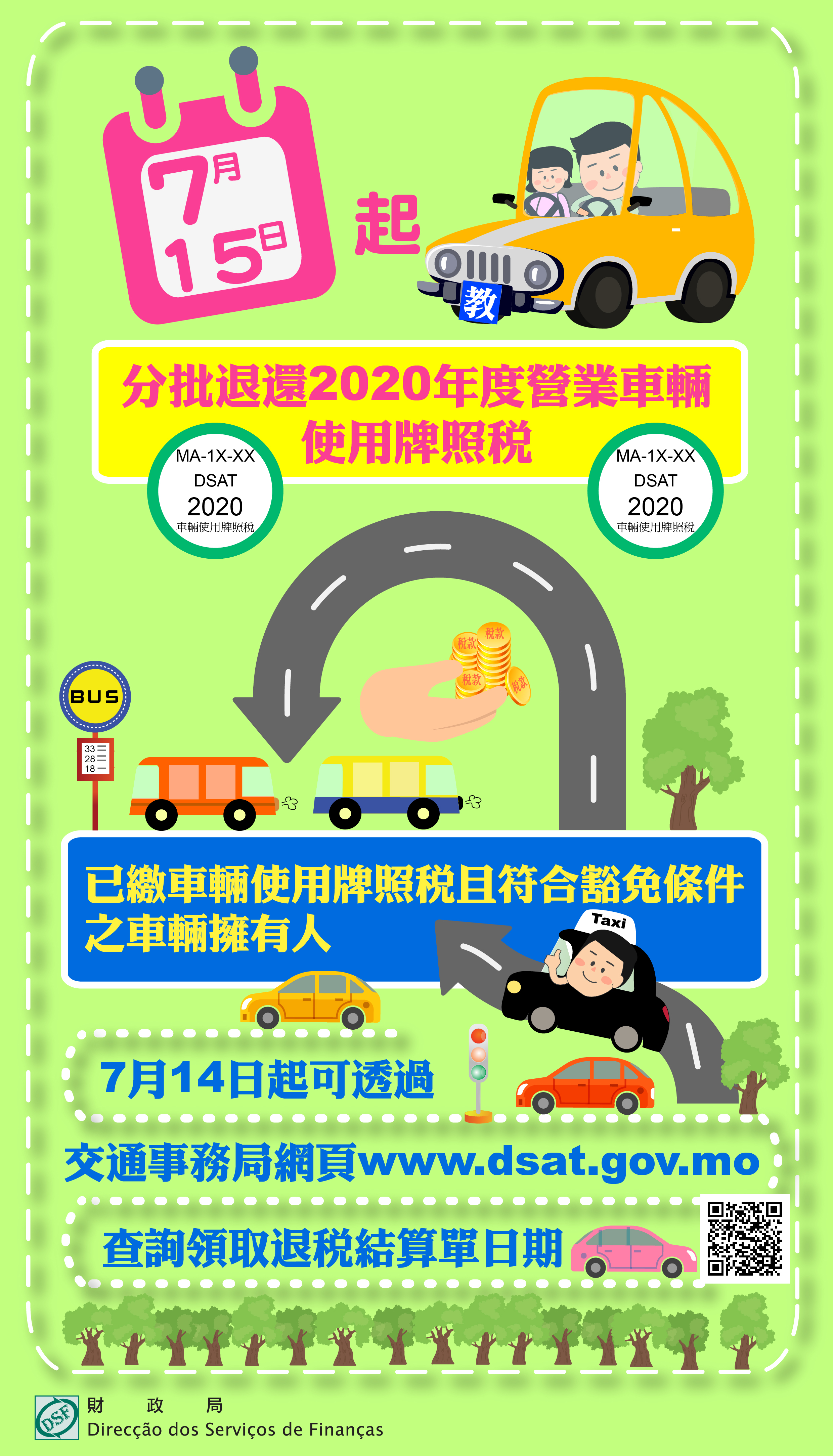 因應新冠肺炎疫情關係,為避免人群聚集,財政局安排於7月15日起分批派發退稅結算單予已繳車輛使用牌照稅並符合豁免條件之上述車輛擁有人。