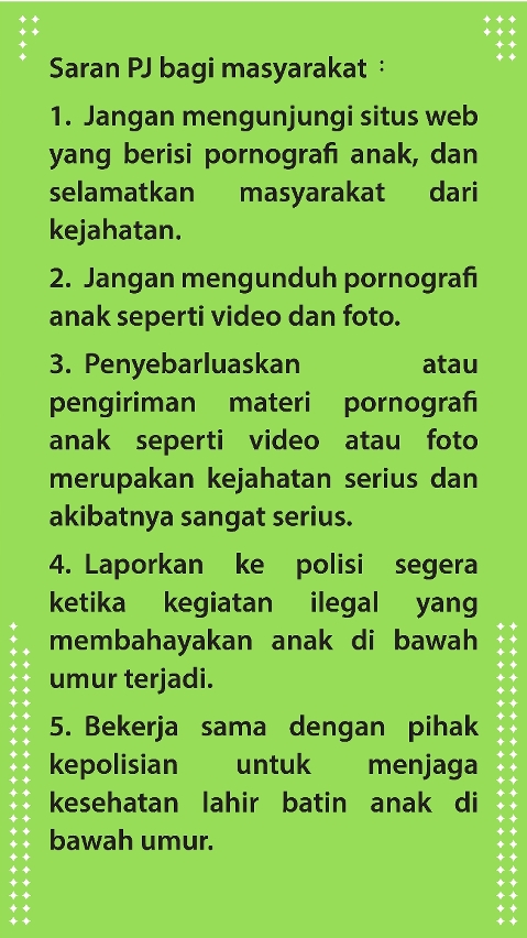 1.     Jangan mengunjungi situs web yang berisi pornografi anak, dan selamatkan masyarakat dari kejahatan.