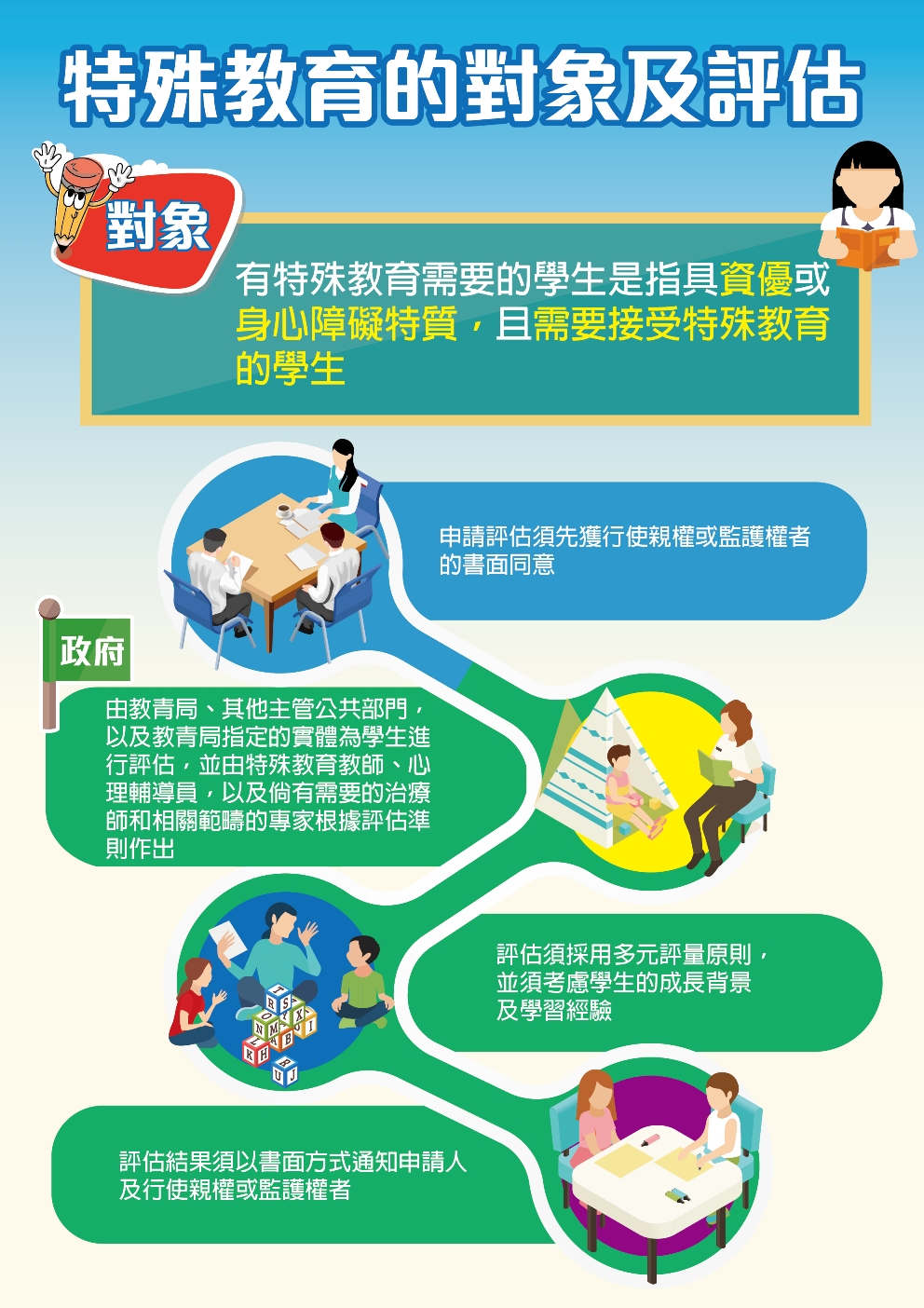 訂定特殊教育應遵守的基本原則,以及評估有特教需要學生的準則,包括須用多元評量原則,使用標準化評量工具,以及考慮學生的成長背景及學習經驗等。