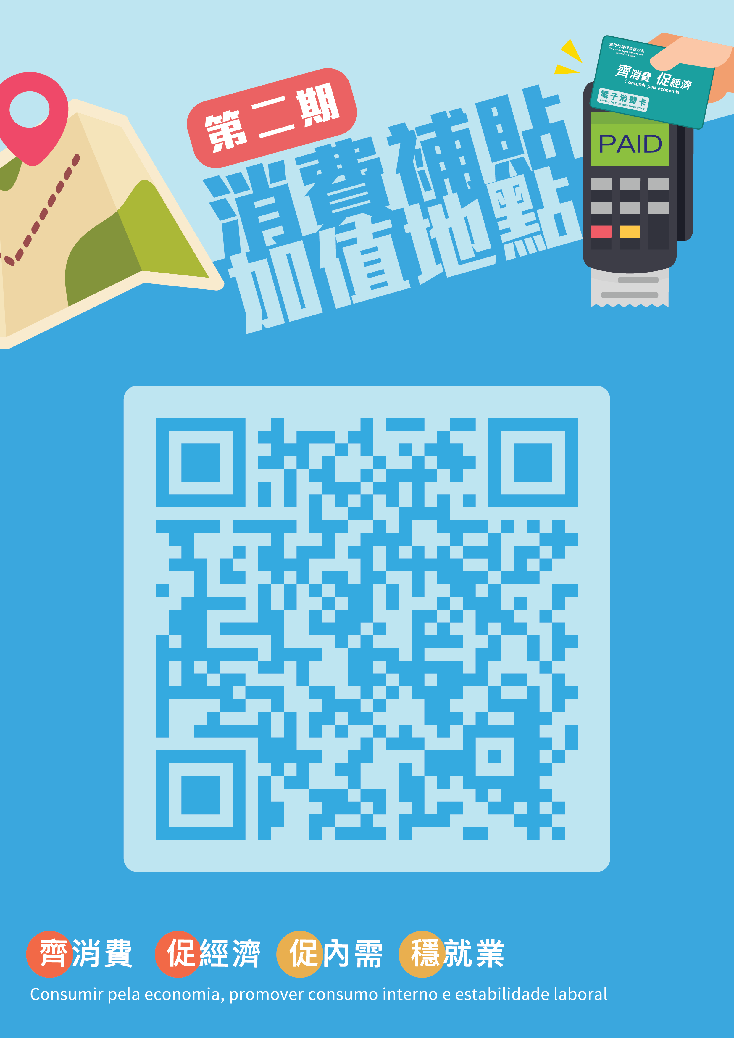 居民可隨時瀏覽經濟局消費補貼計劃專頁以瞭解服務點的分佈 ( https://www.economia.gov.mo/consumo/zh_TW/recharge_value_loc.jsp )。經濟局亦呼籲居民無須急於加值或領卡,第二期消費卡的領取期長達4個半月(7月27日至12月14日),而使用期(8月1日至12月31日)則長達5個月。