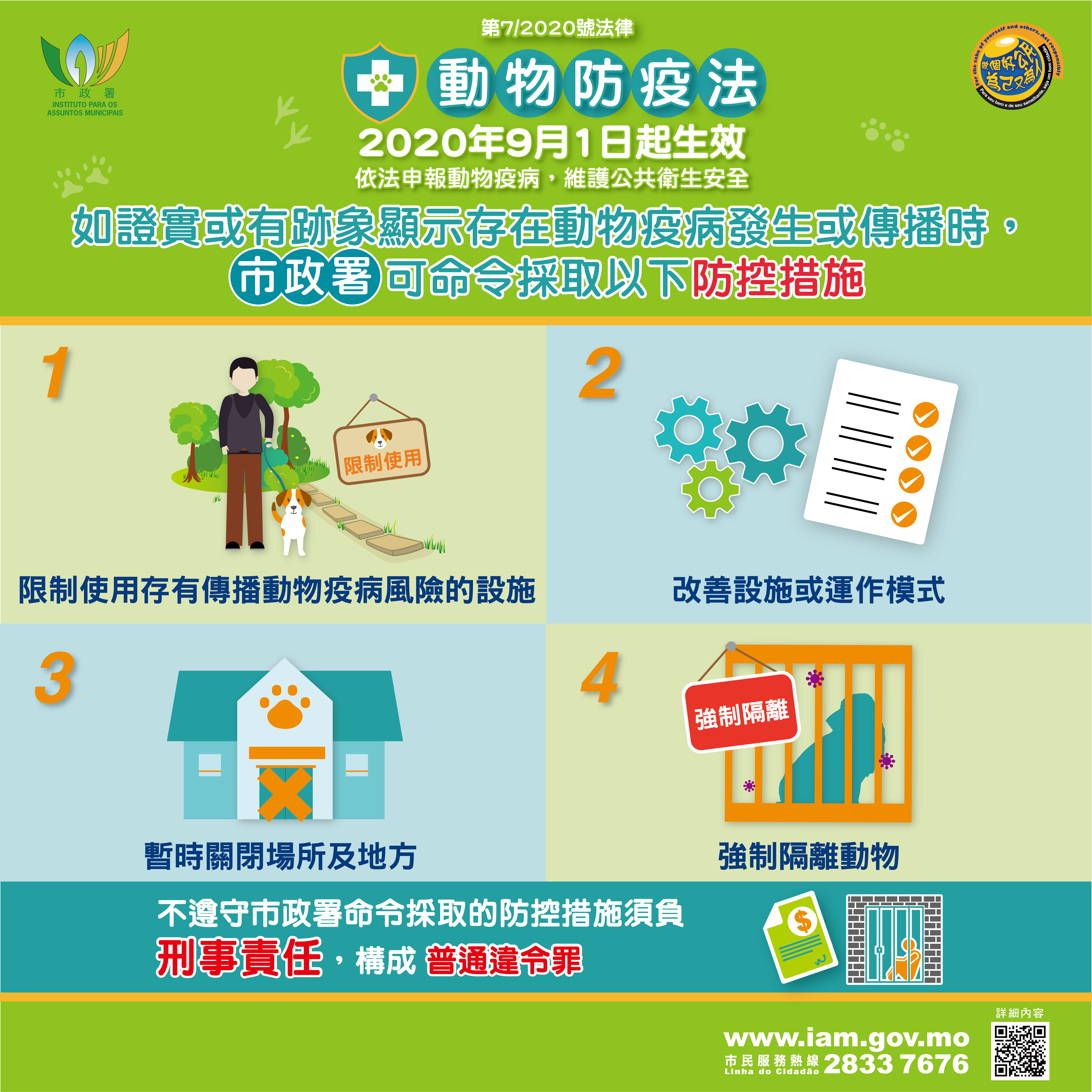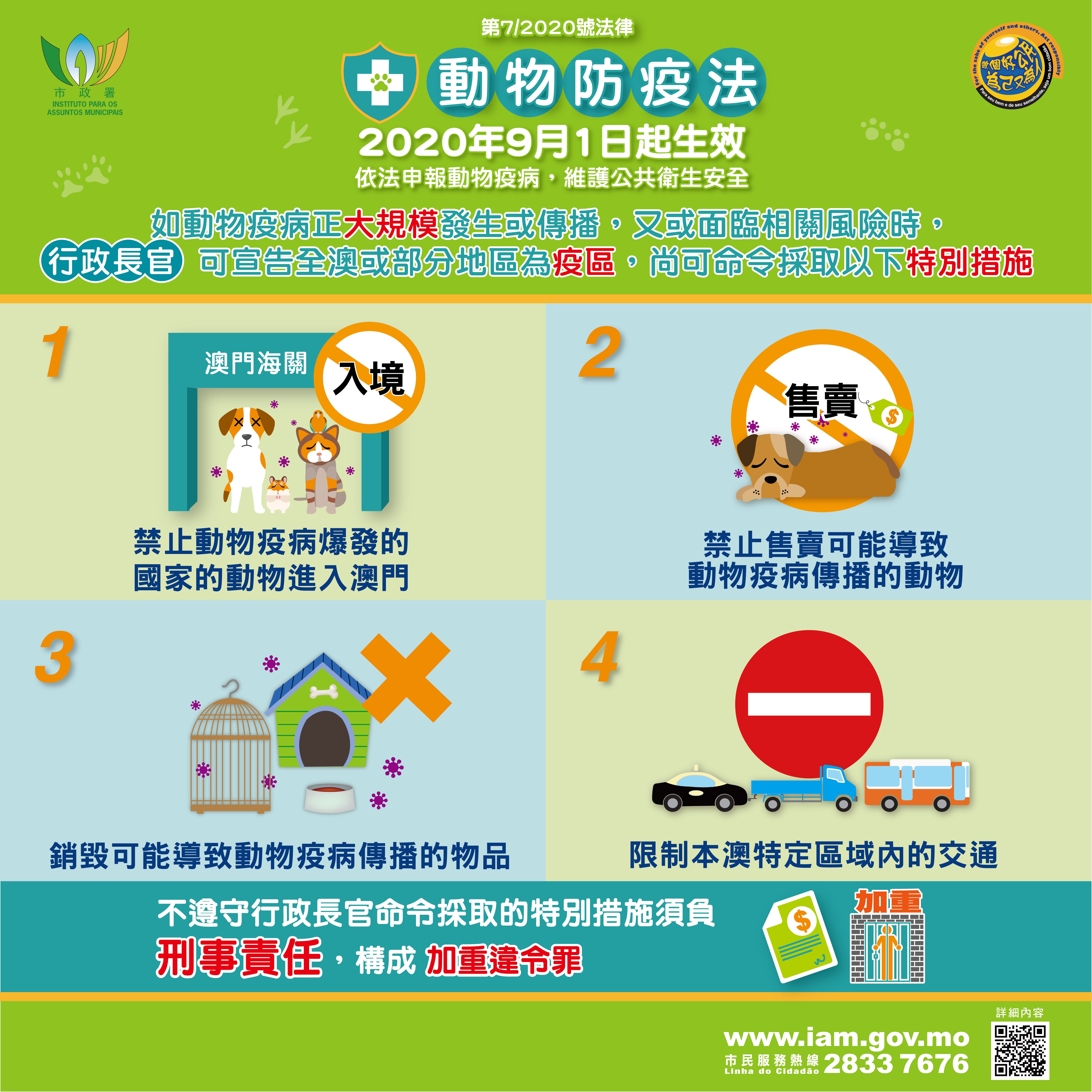 配合《動物保護法》的全面實施,提高本澳動物衛生水平,澳門特區政府制訂了第7/2020號法律《動物防疫法》,對預防及應對動物疫病傳播風險的管制措施作出法律規範,法律將於本年九月一日生效。
