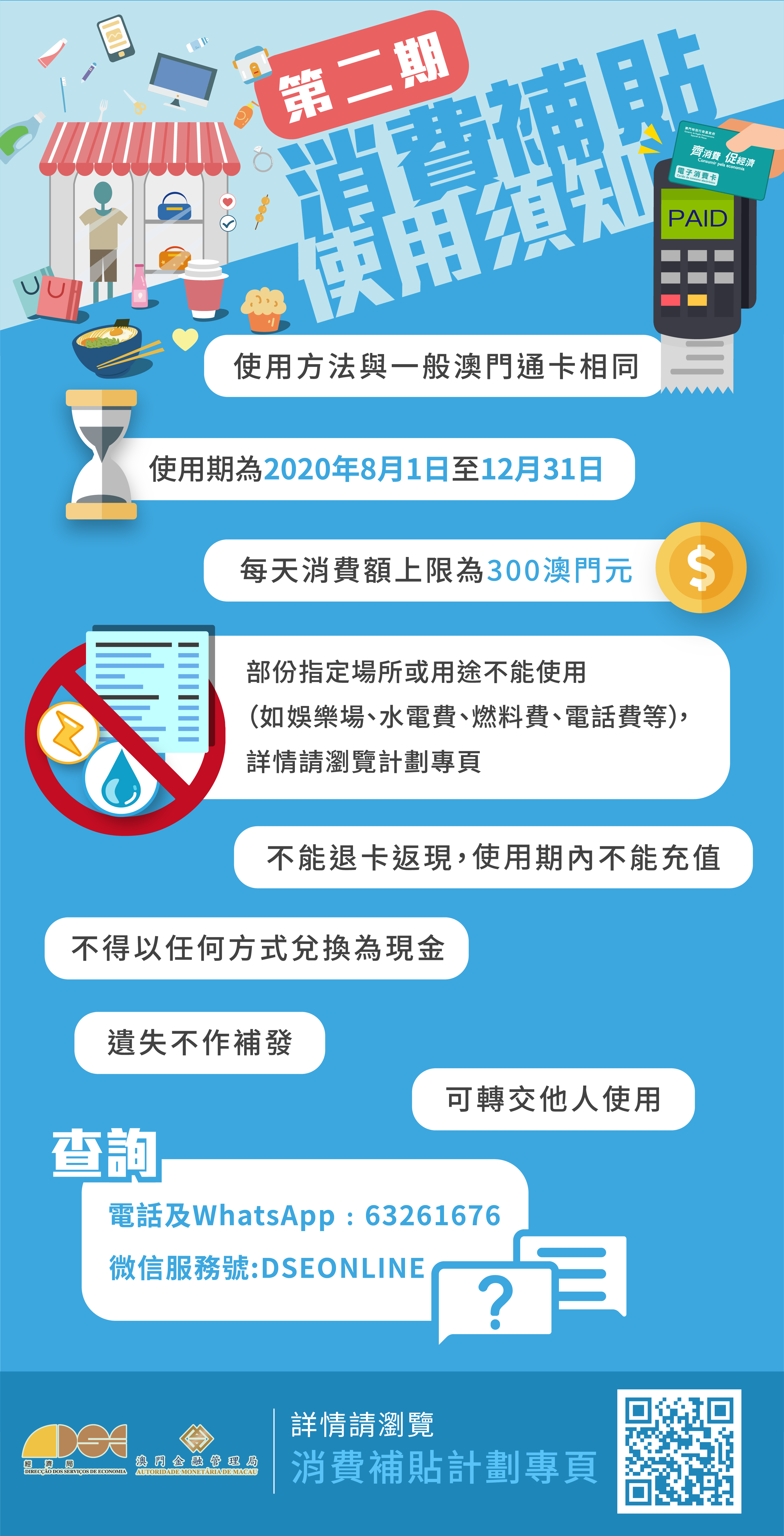 第二期消費卡今(1)日起開始使用,每位合資格居民可獲澳門元5,000元,使用期至本年12月31日,為期5個月。使用範圍與第一期相同,每日使用上限維持為300元。