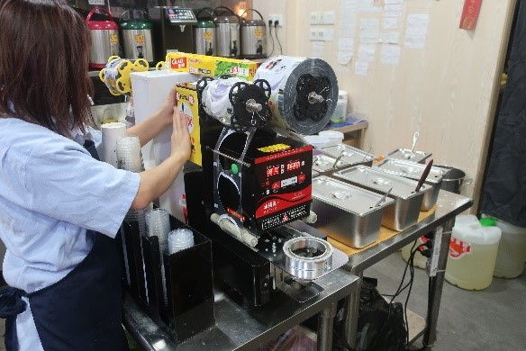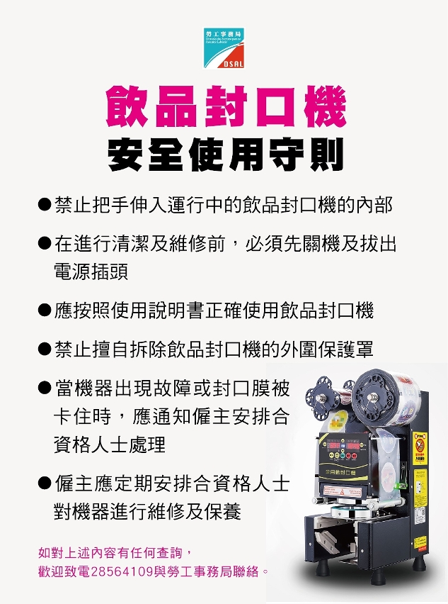 為加強手搖飲品店從業員對安全使用機器的認知,勞工事務局於本年6月派員到全澳各區手搖飲品店進行職安健宣導工作,期間向119間手搖飲品店派發「預防伸手入機器內」和「飲品封口機安全使用守則」的標語貼紙,並提醒業界關注安全使用機器的重要性。與此同時,勞工局人員亦即場與從業員宣傳交流有關工作環境、用電安全、安全使用機器等方面的職安健訊息,商戶普遍支持是次活動,並即時配合在店舖內張貼上述標語貼紙。日後,勞工局會繼續關注各行業的職安健狀況,適時開展更多配合行業特性的職安健推廣活動。
