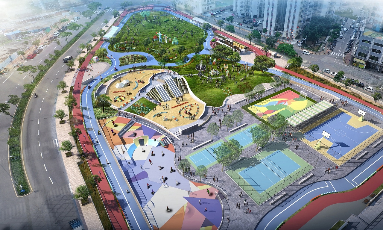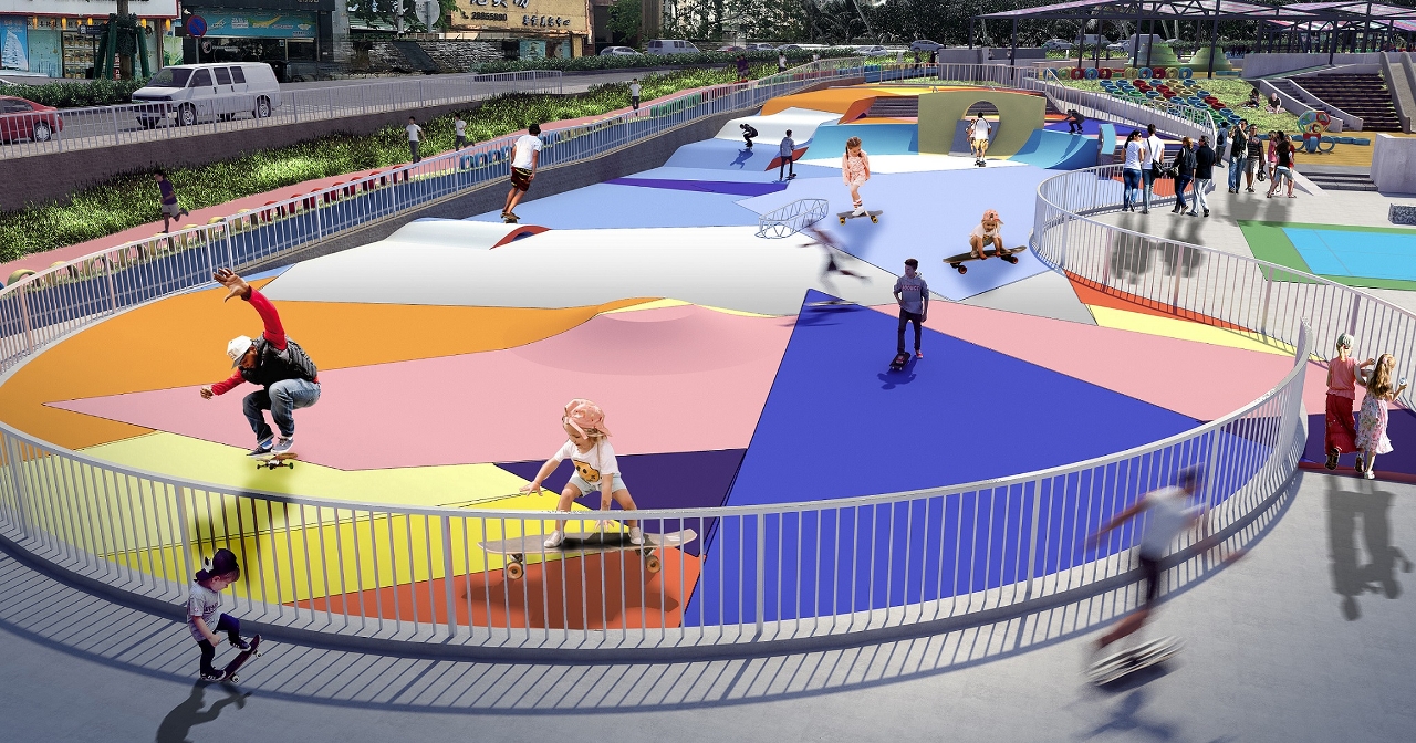 面向青少年的滑板天地,適合初學者及中階人士,利用原地型的高低落差而建,地面配以幾何色塊襯托充滿活力的形象。開心波地,設有足球場、籃球場、排球場及羽毛球場,周邊將設置健身設施、鵝卵石步道、遮陽廊及長椅等。