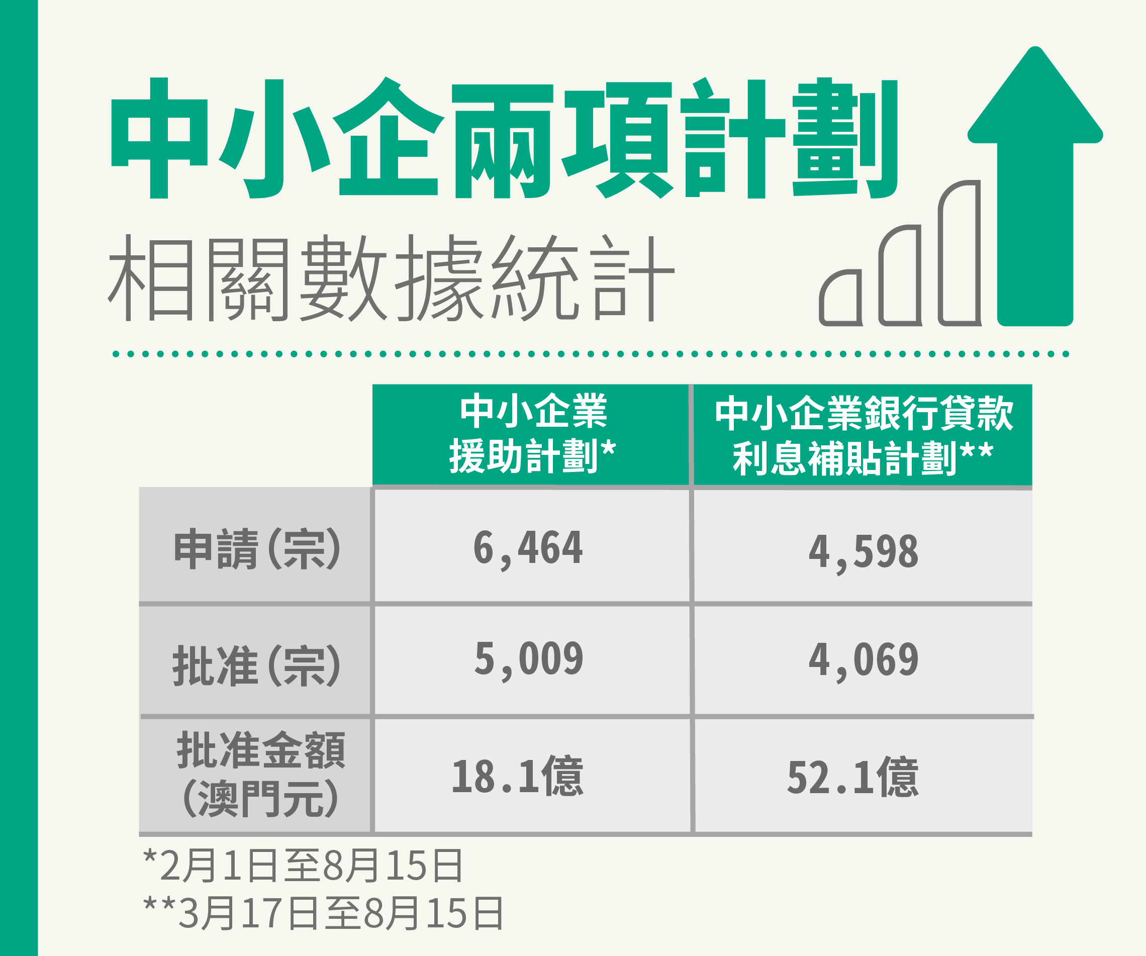 為擴大支援受疫情影響的中小企,特區政府臨時放寬“中小企業援助計劃”的申請條件,營業滿一年且符合其他資格的中小企業,亦可因應疫情影響而提出申請。自2月1日至8月15日,“中小企業援助計劃”共收到6,464宗申請,已批准 5,009宗(約七成八),批准貸款金額約為18.1億;其中,769宗獲批申請受惠於臨時放寬措施。
