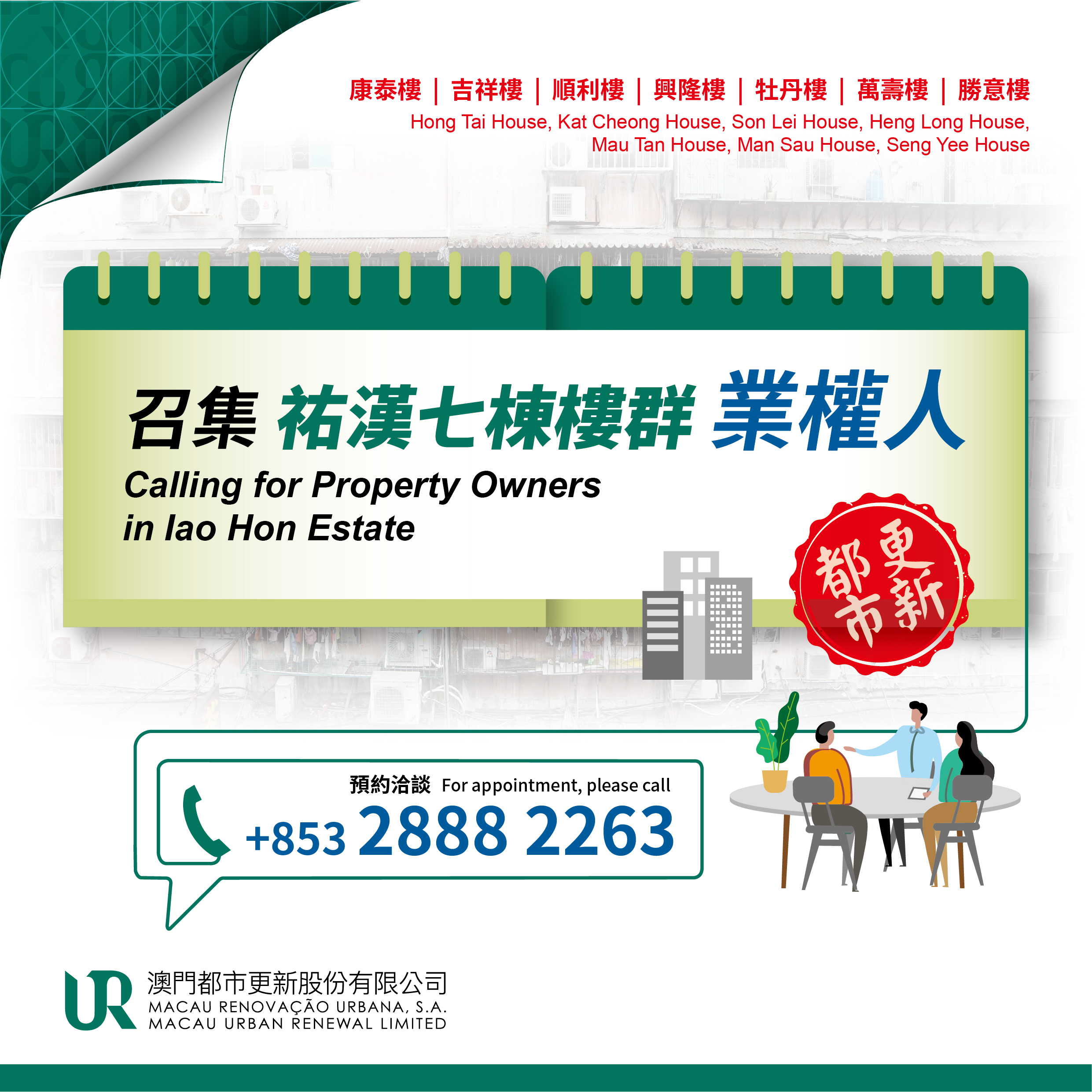 為加快落實都市更新,都更公司已向政府相關部門諮詢該地區規劃,以作「祐漢七棟樓群」區域設計之用。市民欲了解詳情,歡迎瀏覽都更公司網頁「項目」欄目中的「祐漢入戶調查」(網址:https://www.mur.com.mo/iaohon_interviews),或可於辦公時間(星期一至五上午九時至下午一時,下午二時半至六時;星期六上午九時至下午一時)致電都更公司查詢(電話:2888 2263)。