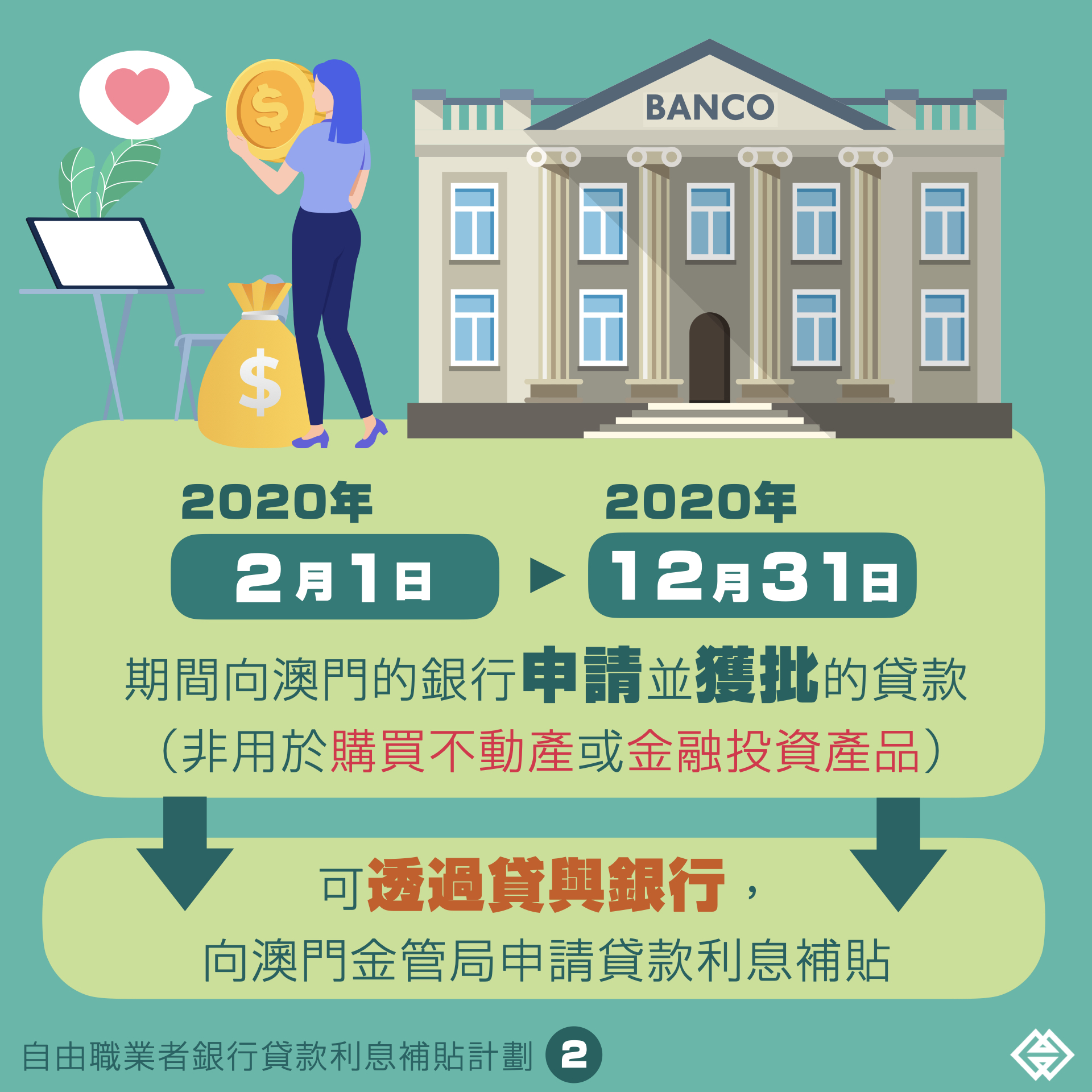 行政法規訂定,未有拖欠特區政府債務的澳門居民,於2020年2月1日至12月31日期間向澳門銀行申請並獲批的貸款,且貸款非用於購買不動產或金融投資產品,可透過貸與銀行向澳門金融管理局申請利息補貼。申請者必須於申請時,為已登記職業稅第二組納稅人,或持有交通事務局所發出的士駕駛員證且經核實從事的士客運業務,但的士車主除外;申請者只可就一筆貸款申請利息補貼,可獲利息補貼的貸款金額上限為10萬澳門元,補貼期由貸款動用日或授信額度起計最長兩年,利息補貼率上限為四個百分點,補貼金額不可超過申請者實際支付的利息金額,每宗最高補貼8,000澳門元。獲許可的補貼款項,將由澳門基金會透過貸與銀行直接存入受益人的帳戶。初步預計合資格的申請人士約有15,000人。