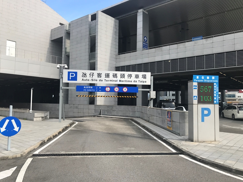 地面層出入口(西面出入口)封閉,車輛可由位於氹仔客運碼頭一樓出境層行車天橋處的入口(東面入口)進入停車場,離場則由地面層的出口(東面出口)離開 |
