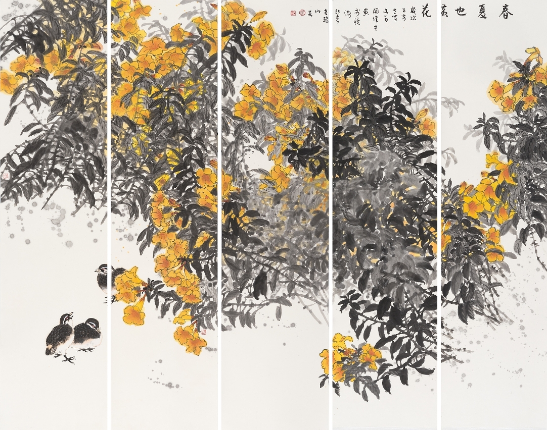 今次展出作品包括山水、花鳥、書法等題材,以花鳥作品為主,多是近年新作,也有少量早期作品。新作多以大自然為題材,盡量摒棄陳舊的表現模式,遵循“外師造化,中得心源”的古訓,到大自然中觀察、感受,將生活氣息融入傳統的筆墨形式之中。