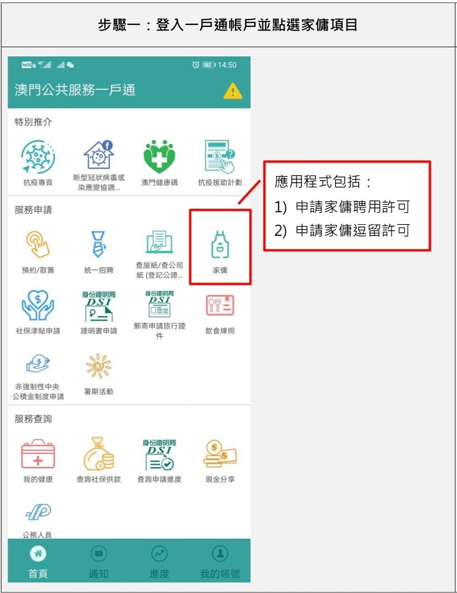 為進一步便利家務工作外地僱員續期,治安警察局經充分應用電子平台功能,將於2020年9月1日在“一戶通”手機應用程式上推出“家務工作外地僱員續期便捷領證服務”,減少家務工作外地僱員前來辦理的次數。僱主只要使用“一戶通”應用程式辦理家務工作外地僱員續期申請,並透過該程式繳納辦證費用,家務工作外地僱員即可在10天(非工作天)後到所選地點(包括:北安出入境事務大樓、黑沙環新街政府綜合服務大樓或離島政府綜合服務中心),同時領取新的“僱員身份的逗留許可”憑條及《外地僱員身份認別證》。