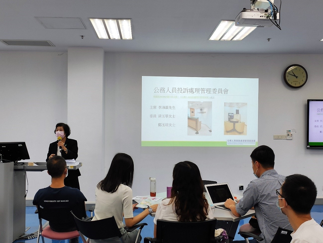 為配合新一屆澳門特區政府的施政方針,落實服務型政府的施政理念,澳門大學舉辦投訴及衝突管理分享座談會。公務人員投訴處理管理委員會委員梁玉華、鄺玉球及支援人員陳思恆與澳大學生事務人員分享處理投訴與衝突的經驗及技巧。