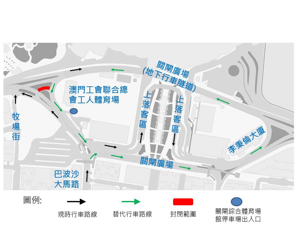 關閘廣場近牧場街之中央調頭行車道封閉,車輛前往關閘綜合體育場館停車場、關閘廣場上落客區取道巴波沙大馬路右轉入關閘廣場經地下行車隧道,詳見附圖。 |
