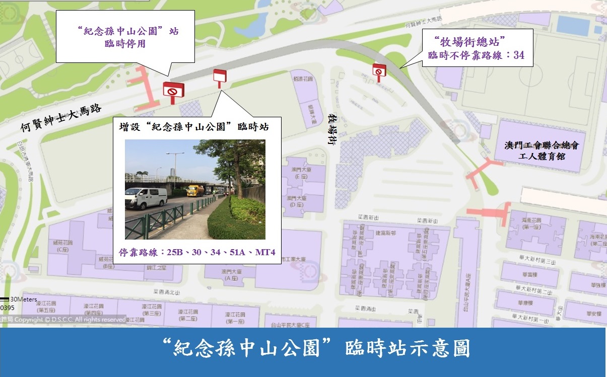 巴士方面,9月9日(周三)上午10時起至9月17日(周四),“紀念孫中山公園”巴士站臨時停用、34路線臨時不停靠“牧場街總站”,乘客可使用臨時站上落,詳情請參閱附表。