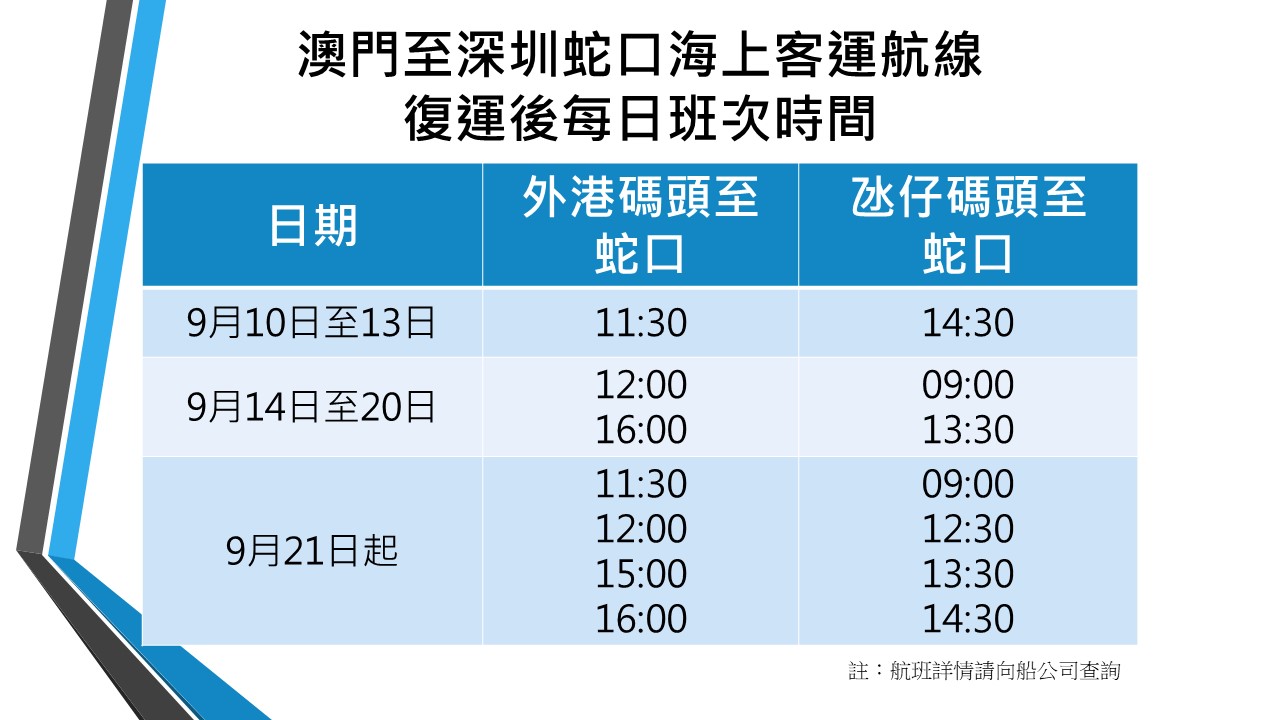 隨著粵澳兩地人員逐步恢復正常往來,為方便市民及旅客,紓緩陸路口岸的通關壓力,經深澳兩地溝通協作,澳門外港客運碼頭和氹仔客運碼頭往返深圳蛇口的兩條海上客運航線,將於2020年9月10日起恢復營運。