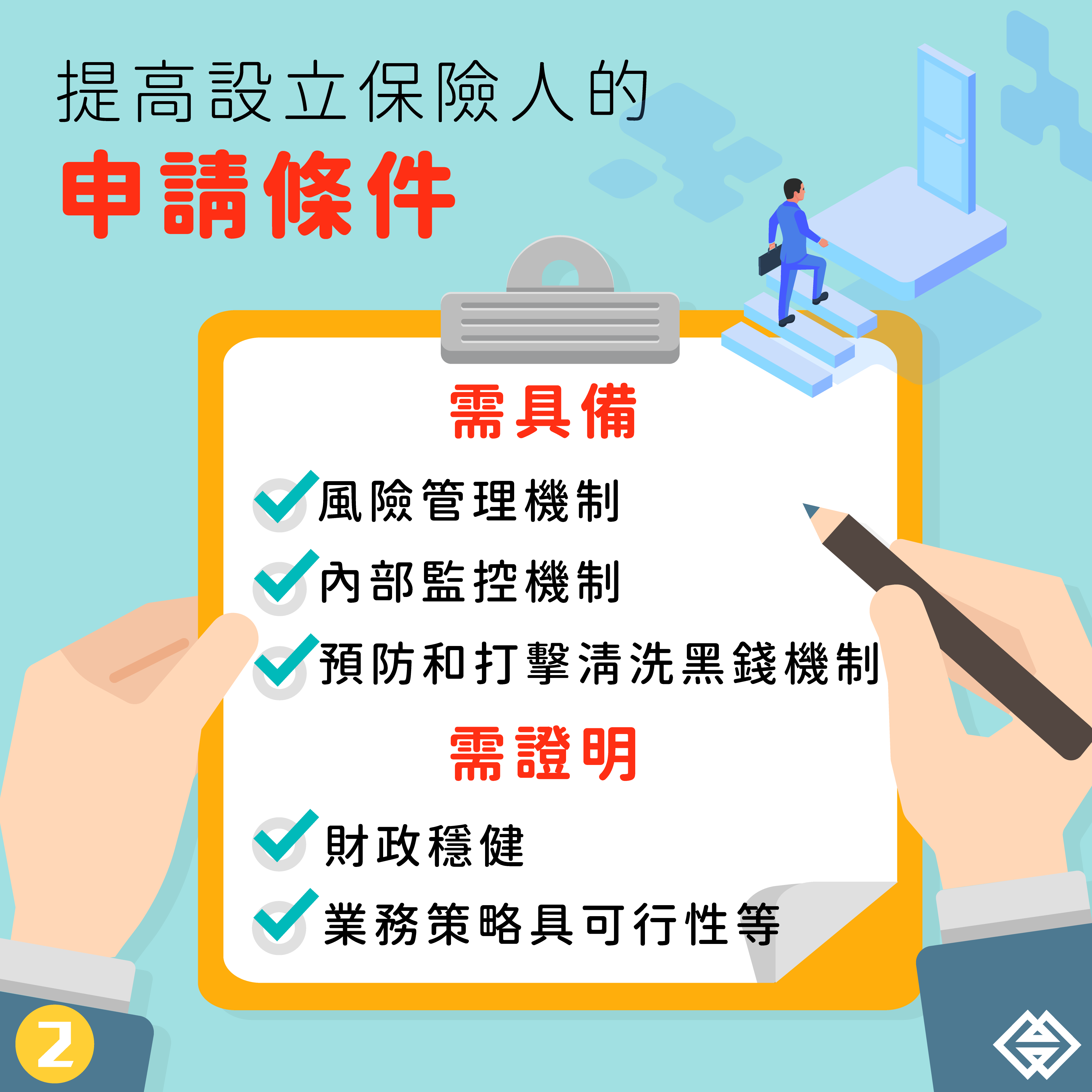 一、 提高設立保險人的申請條件及擴大對申請人的資格審查範圍,加強對保險業的風險管理、內部監控、預防和打擊清洗黑錢及反恐融資機制的要求,確保保險公司具備完善的管治政策;