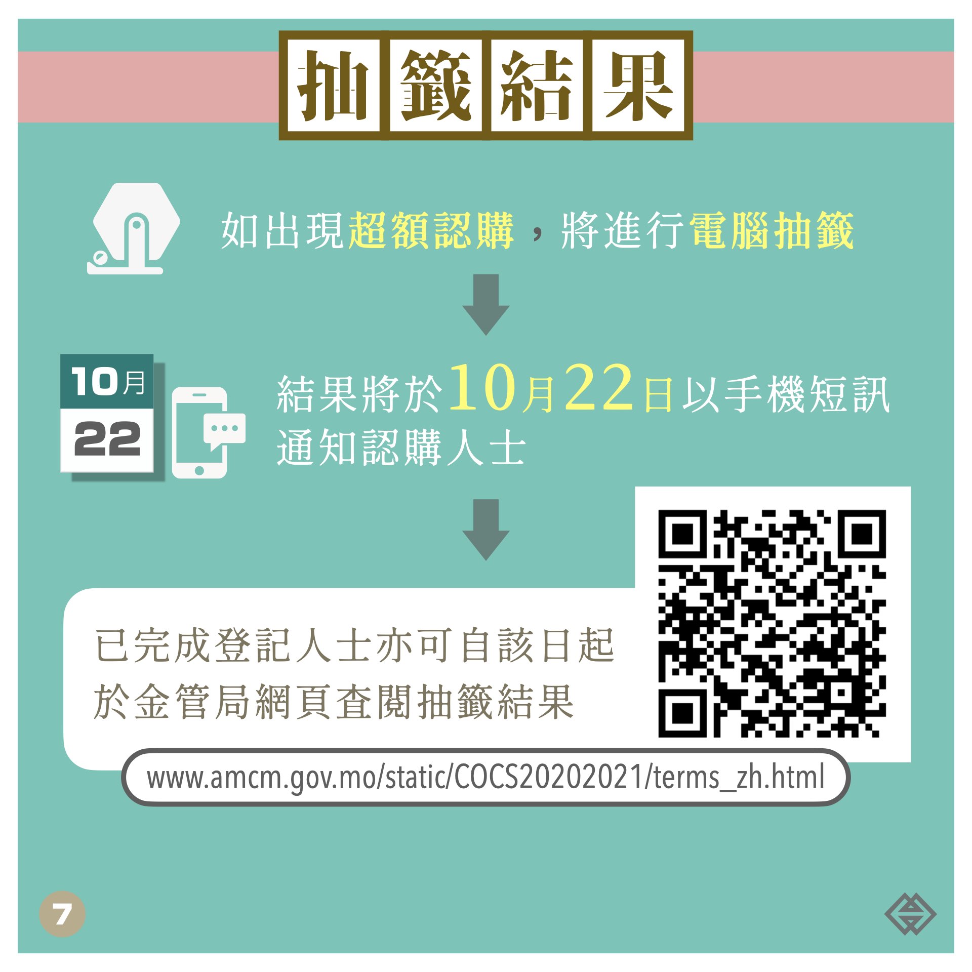 每名澳門居民僅限登記一次,認購上述六款紀念幣各一枚。如出現超額認購將進行電腦抽籤,抽籤結果將於10月22日透過手機短訊通知認購人士,已完成登記的人士亦可自該日起於金管局網頁(https://www.amcm.gov.mo/static/COCS20202021/terms_zh.html)查閱抽籤結果。