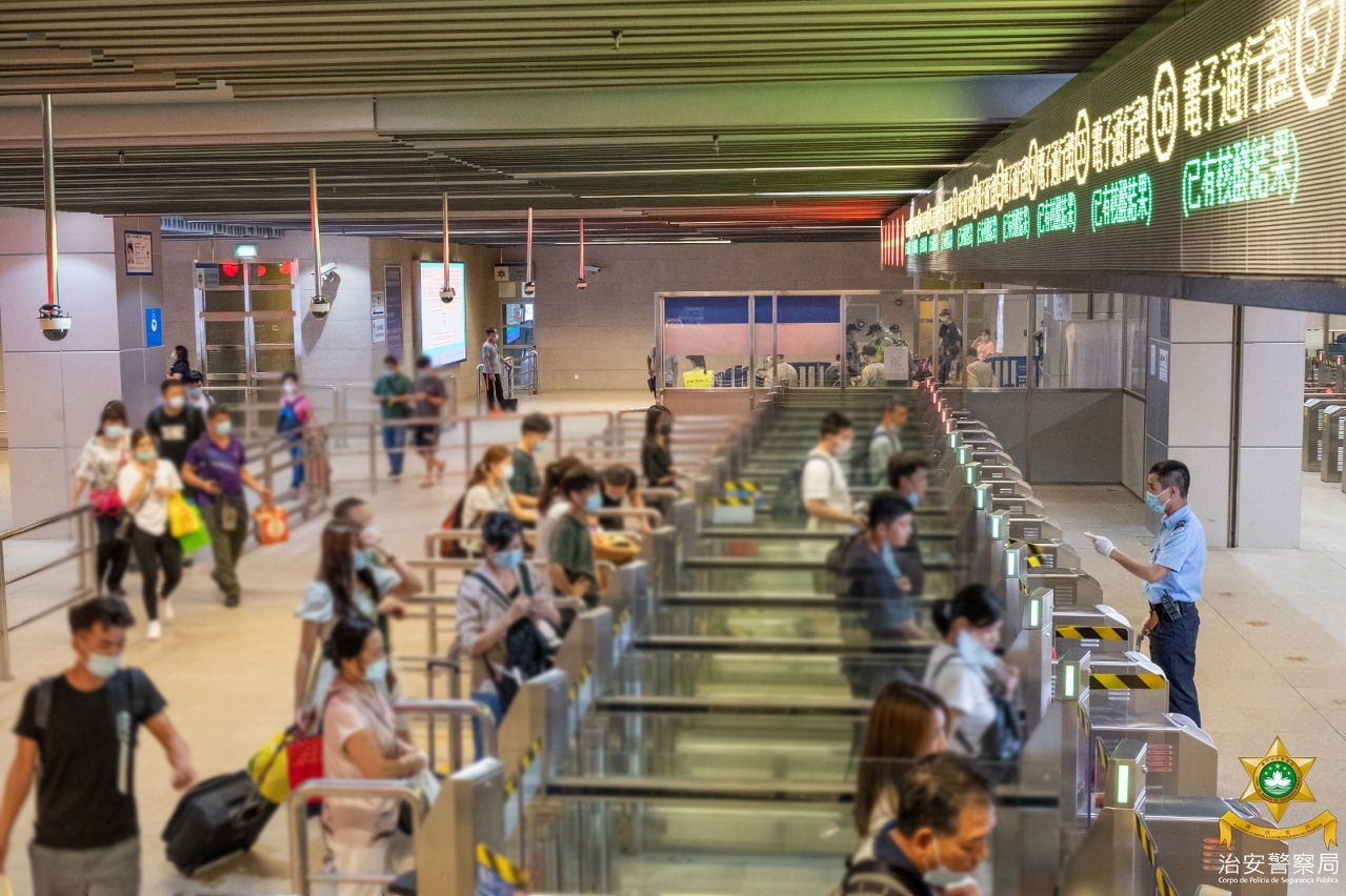 於國慶“黃金周”首五天(10月1至5日),治安警察局於各口岸做好充份警力部署,與內地相關部門保持緊密聯繫及加強訊息交換,於口岸周邊適時採取交通疏導措施,以確保口岸通關暢順及交通安全有序。於10月1日至5日,全澳各出入境口岸合共錄得117.7萬人次出入境,當中入境訪澳旅客有9.8萬人次,數據亦顯示大部份內地旅客選擇經關閘口岸取道進出本澳;而本澳居民出入境人次佔整體的多數,錄得52.1萬人次。治安警察局亦因應現場人流情況對通關人士作分流,協助仍未轉換「健康碼」的通關人士進行相關操作,以保障珠澳通關人流暢順。