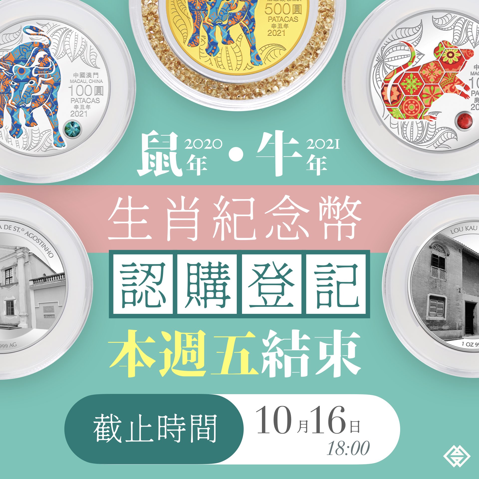 2020鼠年及2021牛年生肖紀念幣網上認購登記將於本週五(16日)下午6時正結束,澳門金融管理局呼籲有意認購的市民,儘快進行網上登記。