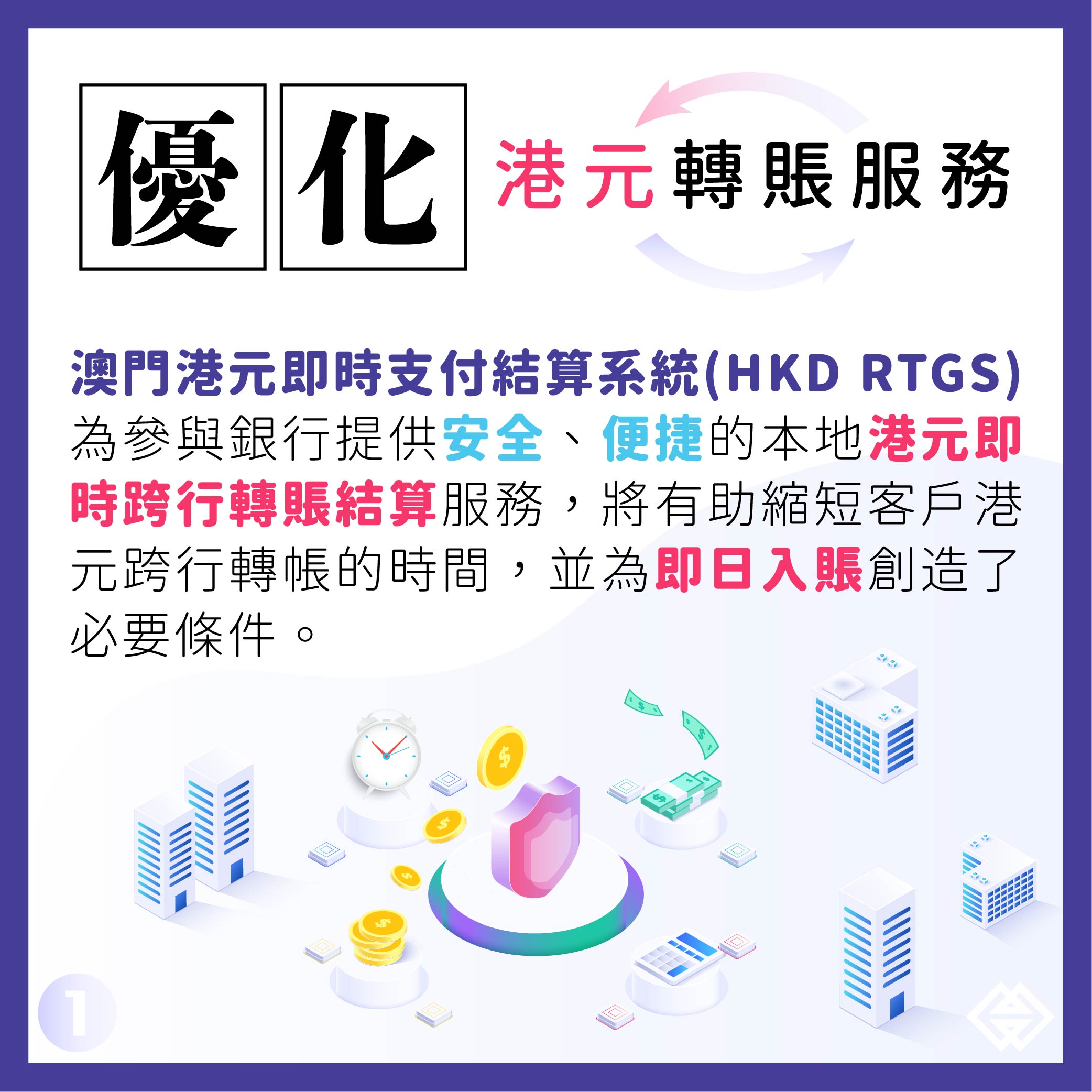 金管局金融基建及資訊廳總監劉奇峰表示,港元在澳門的應用十分普及,相當部份大額經濟交易以港元計價結算。為協助銀行向市民及商戶提供更高效、更安全的港元轉賬服務,金管局於10月19日推出“澳門港元即時支付結算系統(HKD RTGS)”讓澳門銀行免費接入,向銀行提供標準化的即時跨行轉賬結算服務。現時,全澳已有28間銀行接入HKD RTGS,首日運作暢順,處理了本地約94億港元的交易。受惠於標準化的即時跨行轉賬結算服務,銀行客戶的跨行港元轉賬處理時間將可縮短,並在特定的情況下具備了即日入賬的必要條件。