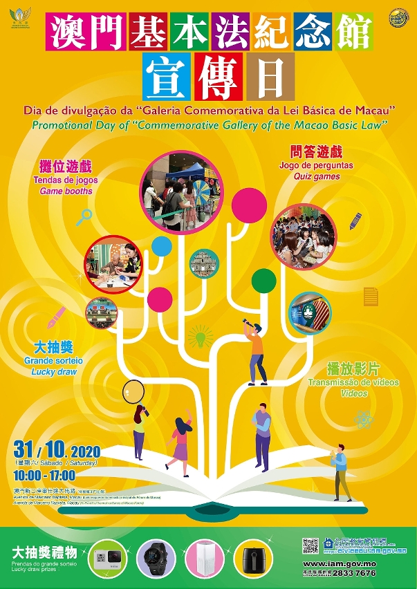 為積極推動市民對《憲法》與《基本法》以及「一國兩制」有更多認識,加深愛國愛澳情懷,市政署將於十月三十一日(星期六)舉辦「澳門基本法紀念館宣傳日」活動,透過攤位遊戲、影片播放等環節,寓教於樂地進行推廣。凡參加當日問答遊戲並答案全對者,將可參與大抽獎環節,有機會獲得電子產品、家庭電器及購物券等豐富大獎,歡迎市民踴躍到場參與。