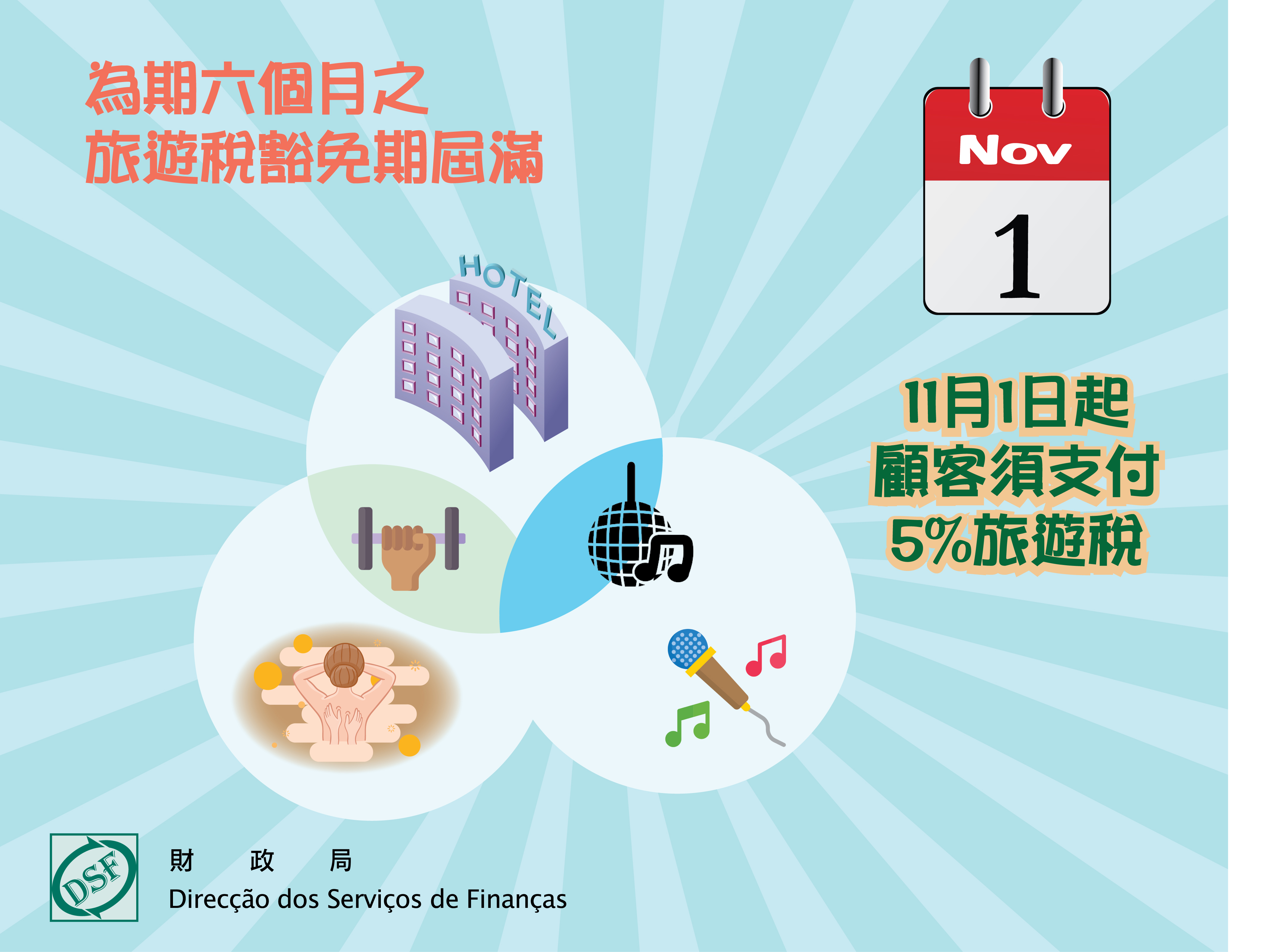 因應疫情的影響,特區政府早前實施一系列稅費減免措施,其中根據第3/2020號法律修改第22/2019號法律第十六條第三款,豁免以下場所為期六個月之旅遊稅:第16/96/M號法令中第五條屬第一、二、三組的酒店場所,第六條屬第二組及第三組的同類場所之豪華及一級舞廳及酒吧,以及《旅遊稅規章》第一條b)項所指的健身室、桑拿浴室、按摩院及卡拉OK場所,豁免期自2020年5月1日起至10月31日止。