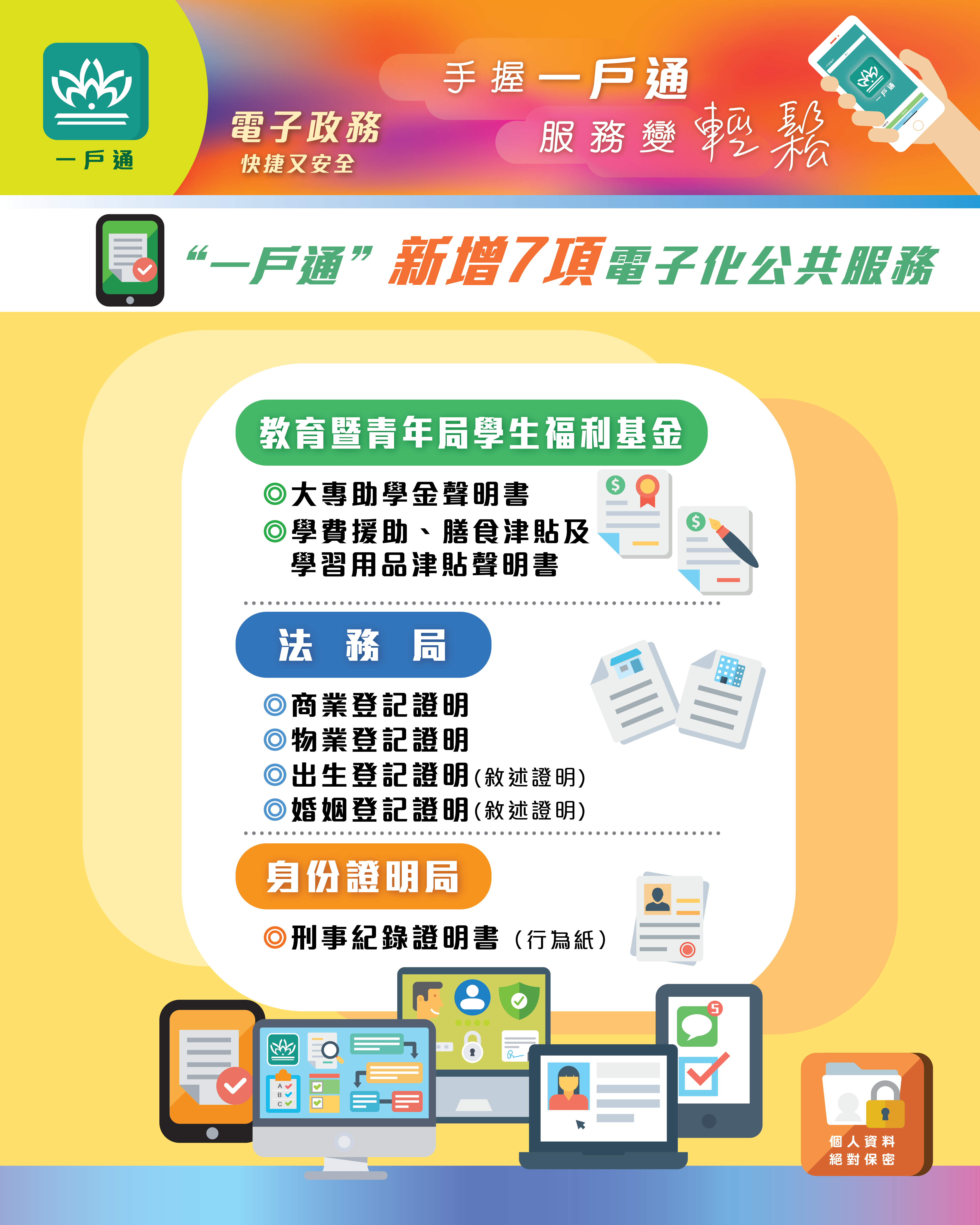 “澳門公共服務一戶通”平台新增七項電子化公共服務,包括申領電子證明及辦理聲明書。凡已開立“一戶通”帳戶的市民,可透過有關網站和手機應用程式,在線上完成整個服務流程及進行電子支付。至目前為止,“一戶通”提供三十三項電子化公共服務,行政公職局將持續與各部門協調合作,推動更多電子化服務進駐“一戶通”,推進公共服務電子化,營造便民便商的環境。