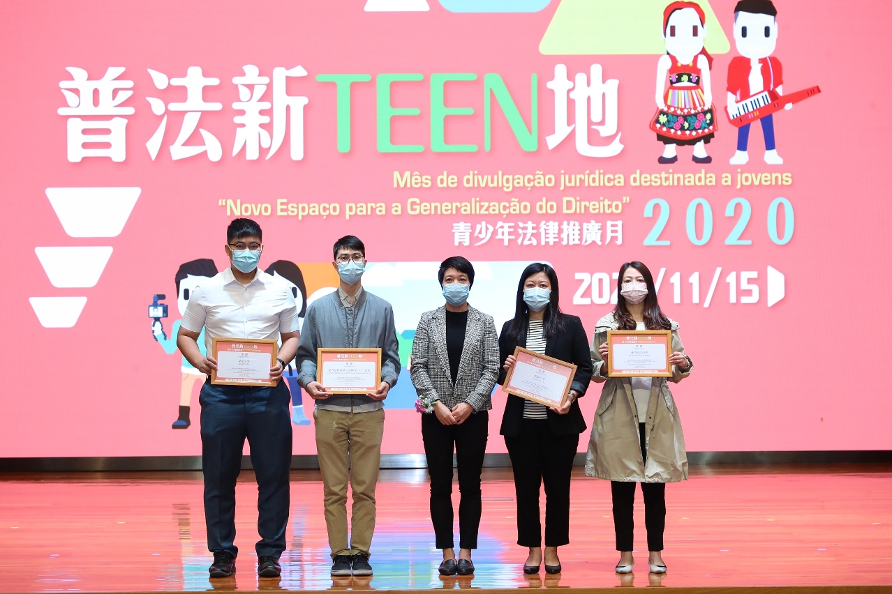 為延續推廣法律普及的工作及總結有關活動成效,上述部門於11月15日假婦聯學校禮堂舉行了“普法新TEEN地”青少年法律推廣月總結暨頒獎禮,出席嘉賓包括警察總局劉運嫦局長助理、教育暨青年局龔志明副局長、法務局梁葆瑩副局長、文化局梁惠敏副局長、教育暨青年局青年廳張敏輝廳長、社會工作局防治賭毒成癮廳鄭耀達廳長、司法警察局社區警務及公共關係處鄭寶湘處長、治安警察局公共關係處李德輝副警務總長、市政署公民教育處林微笑處長、高等教育局高等院校學生輔助處黃月冰處長、勞工事務局准照及技術支援處林佩馨代處長、法務局公共關係處黃嘉慧代處長、消防局研究及策劃廳李梓豪副一等消防區長、青年事務委員會委員,以及各參與學校及機構代表等。