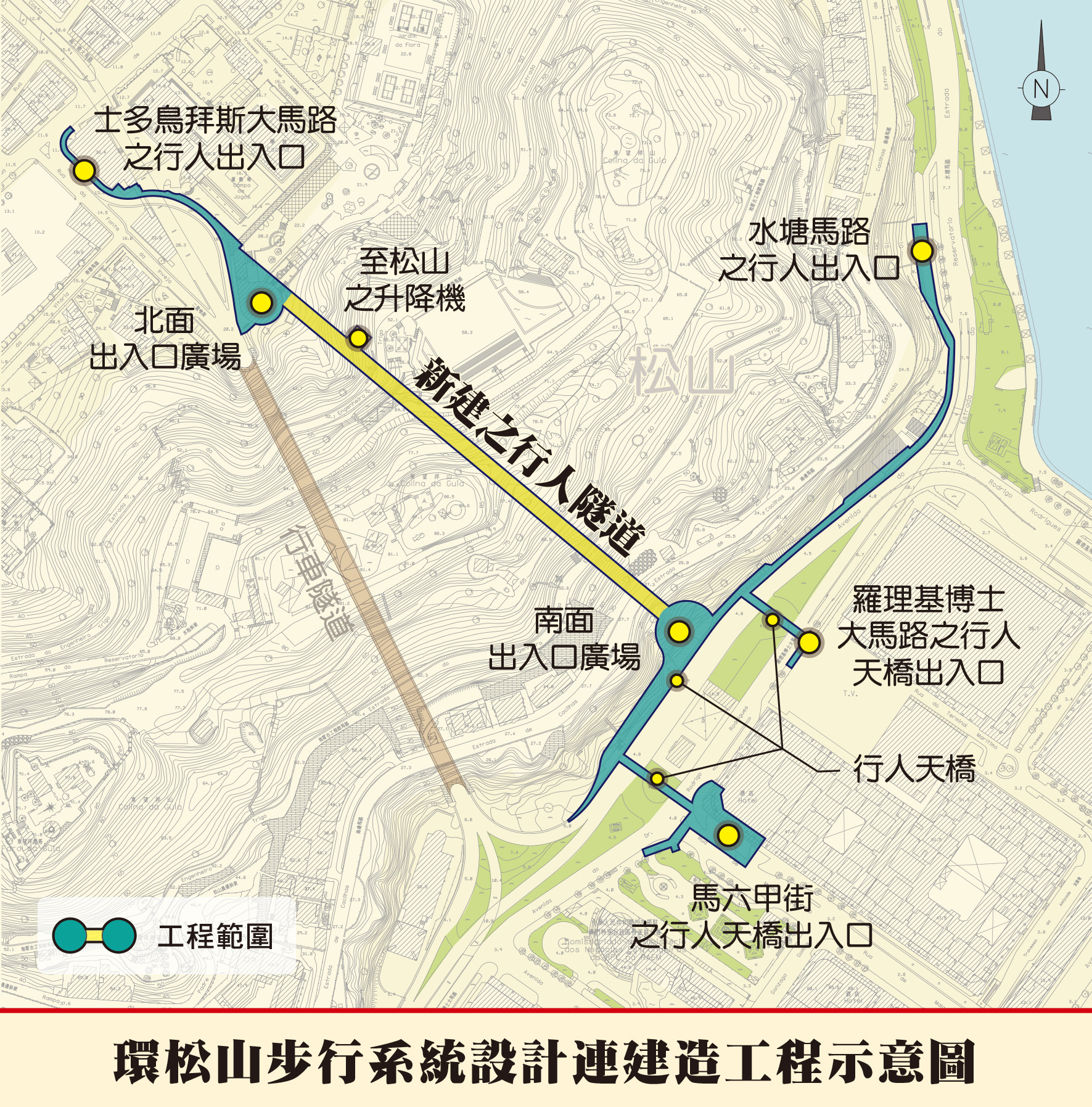 “環松山步行系統”工程將於短期內開展現場施工。工程於松山新建一條行人隧道,貫穿松山南北兩端,連接新口岸區與高士德大馬路一帶,為行人提供安全便捷的無障礙步行環境,縮短步行距離。工程分階段推進,施工期565日,期間將採取多項措施減低影響。
