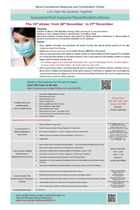 新型冠狀病毒感染應變協調中心公佈,第24輪保障口罩供應澳門居民計劃於本周六(28日)開始,售賣期間為30日,即11月28日至12月27日。