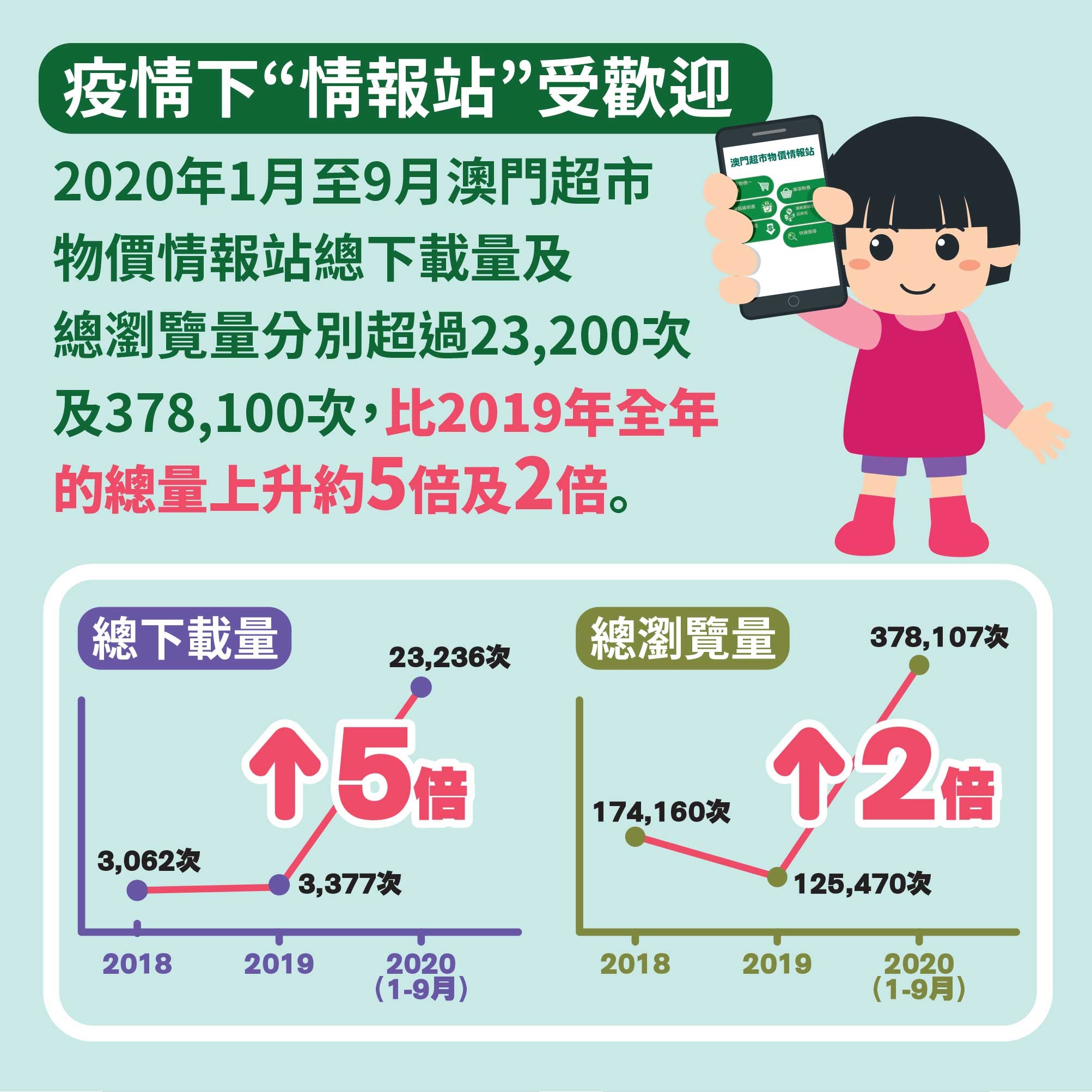 為回應消費者在疫情下對物價資訊的需求,消委會優化“情報站”功能,更方便消費者貨比三家, 2020年錄得“情報站”的使用量每月持續上升,創出“情報站”推出以來歷年新高。截至今(2020)年9月總下載量及總瀏覽量,分別超過23,200次及378,100次,比2019年全年的總量上升約5倍及2倍。消委會將繼續加強物價調查工作,豐富與優化“情報站”的各項功能。