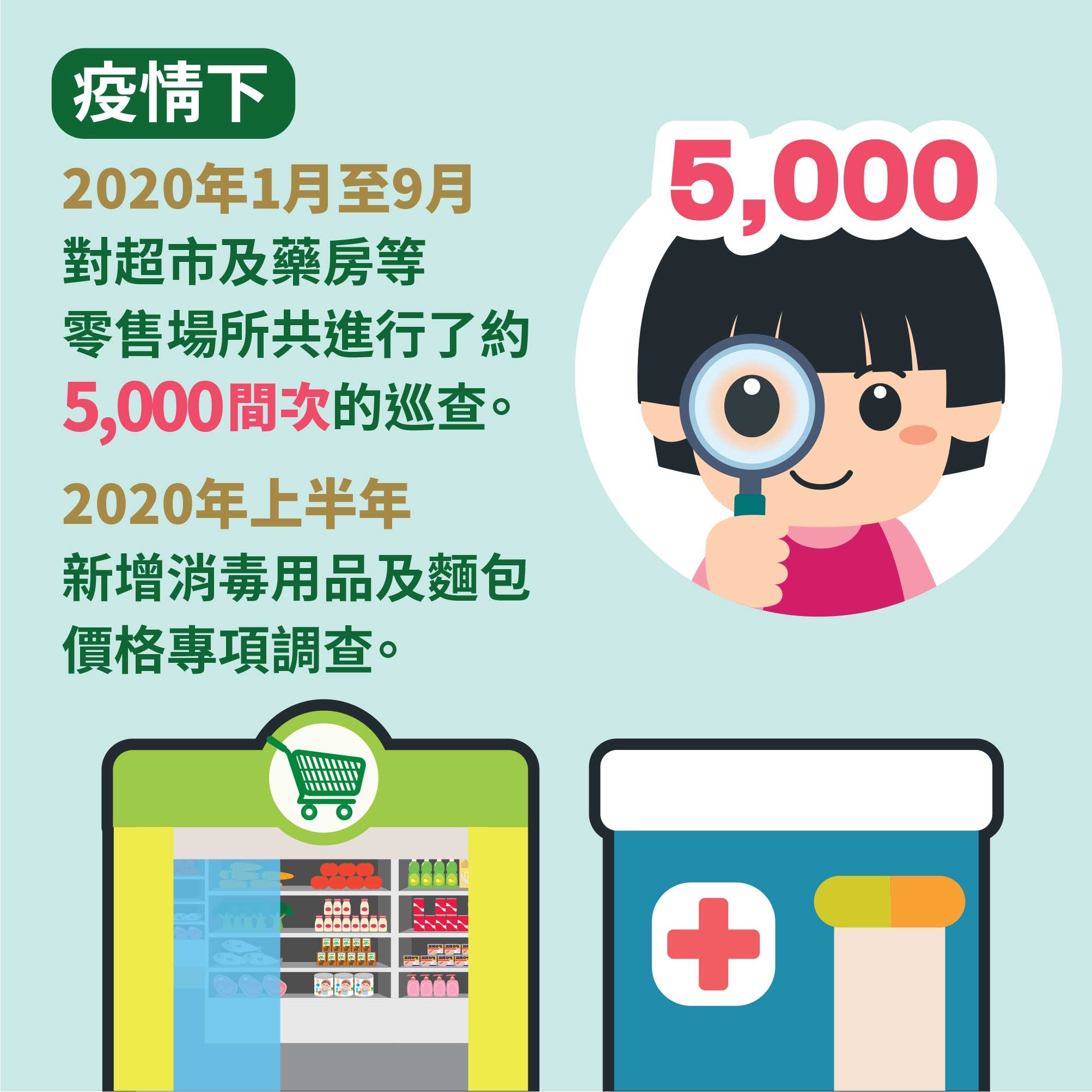 消費者委員會在疫情期間把“保供應、穩物價”作為首要的工作,加強巿面巡查,致力提高物價透明度,年初至9月,巡查次數逾5,000間次,並已公佈354份調查報告。不斷優化的物價情報站格價功能受到居民歡迎,首三季錄得23,200多次下載量及378,100次瀏覽量,分別較去年全年大幅上升5倍及2倍。