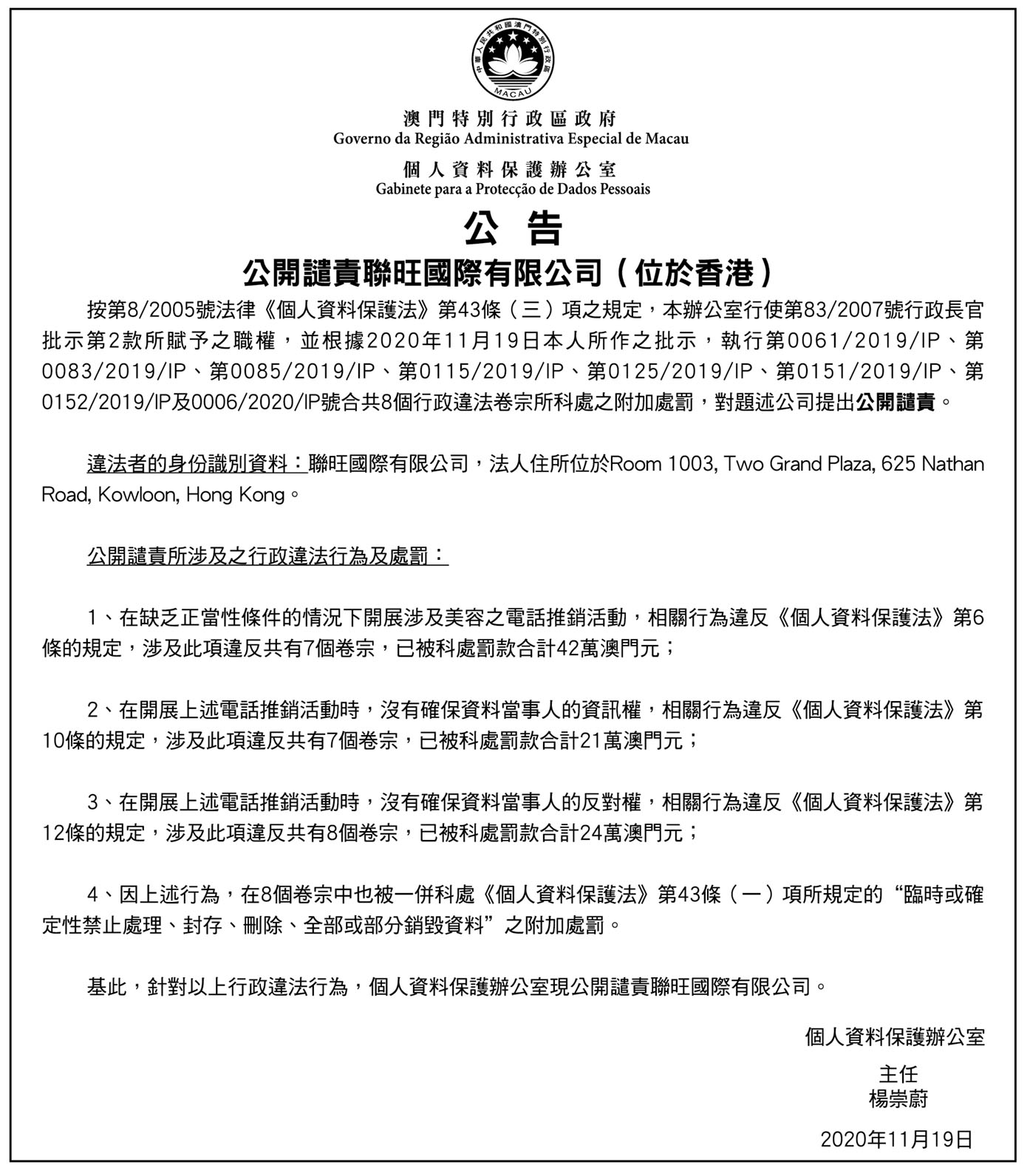 就上述事宜,個資辦今天在一份中文及一份葡文報章上刊登多份公告,分別執行多個附加處罰及提醒相關機構依法營商。