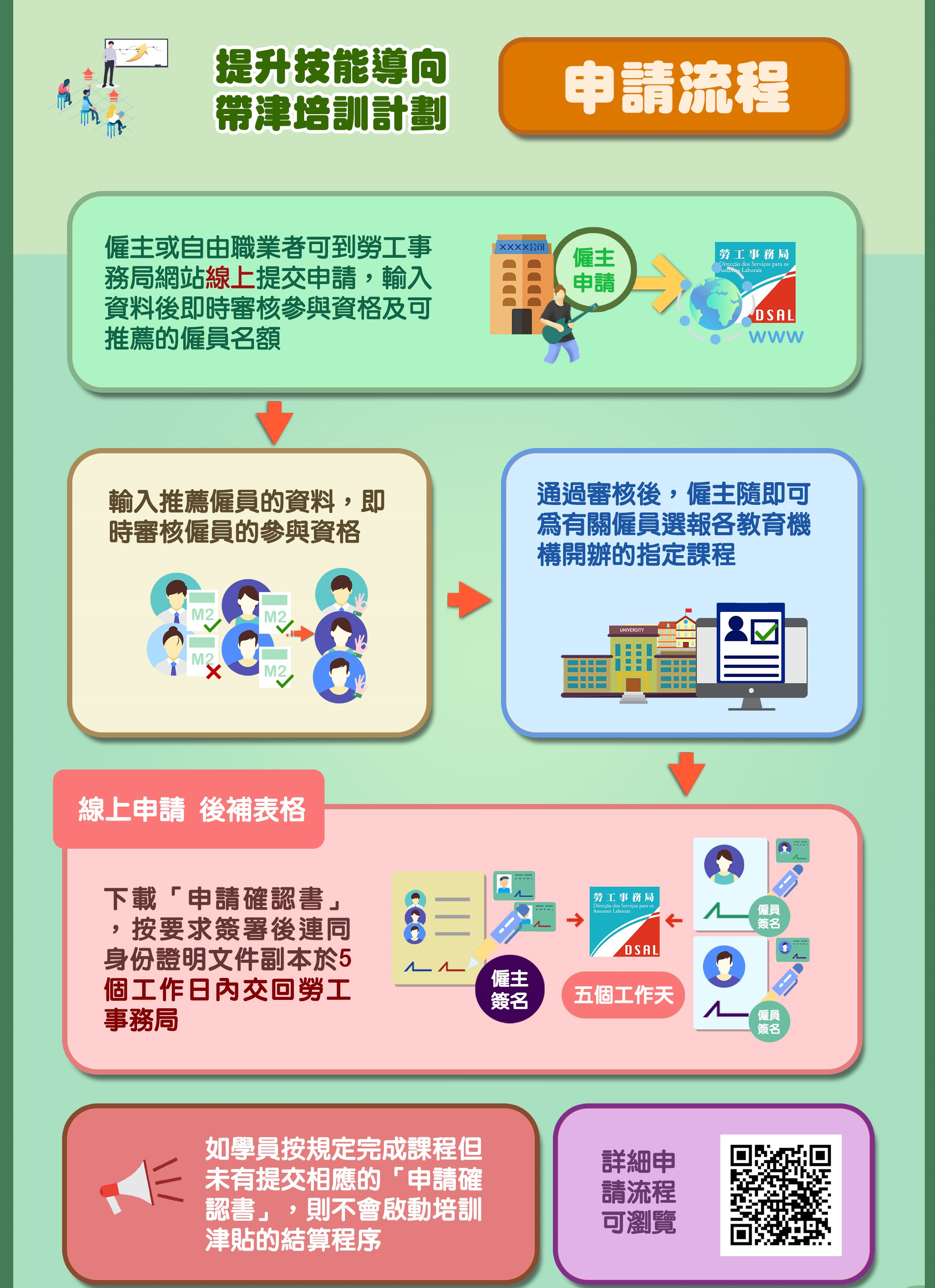 為方便報名手續,“就業導向帶津培訓計劃”及“提升技能導向帶津培訓計劃”均設有網上報名系統,亦歡迎有需要人士帶備報名所需文件前往勞工事務局總辦事處(馬揸度博士大馬路221-279號先進廣場大廈地下)及職業培訓中心(關閘馬路101-105A號太平工業大廈第一期地下)辦理。因應市場情況,後續課程將分階段按月推出。