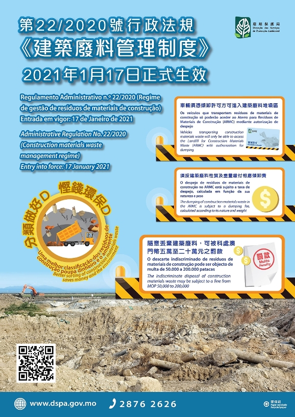 第22/2020號行政法規《建築廢料管理制度》(以下簡稱《制度》)於2021年1月17日起生效,法規訂定運載建築廢料以作傾卸的車輛須事先取得環境保護局發出的傾卸許可(傾卸許可的請求由車輛的所有人提出),方可進入建築廢料堆填區,並須按所傾卸廢料的性質及重量計算傾卸費。至於在法規生效之日前已判給或有關提交投標書期間已截止的公共或私人工程的總承建商,可獲豁免在法規生效後三年內繳付在建築廢料堆填區傾卸該等工程所產生的建築廢料費用,但須在法規公佈之日起計二百一十日內(即2021年2月15日或之前)向環保局提出申請。環保局呼籲業界儘快辦理上述申請手續。