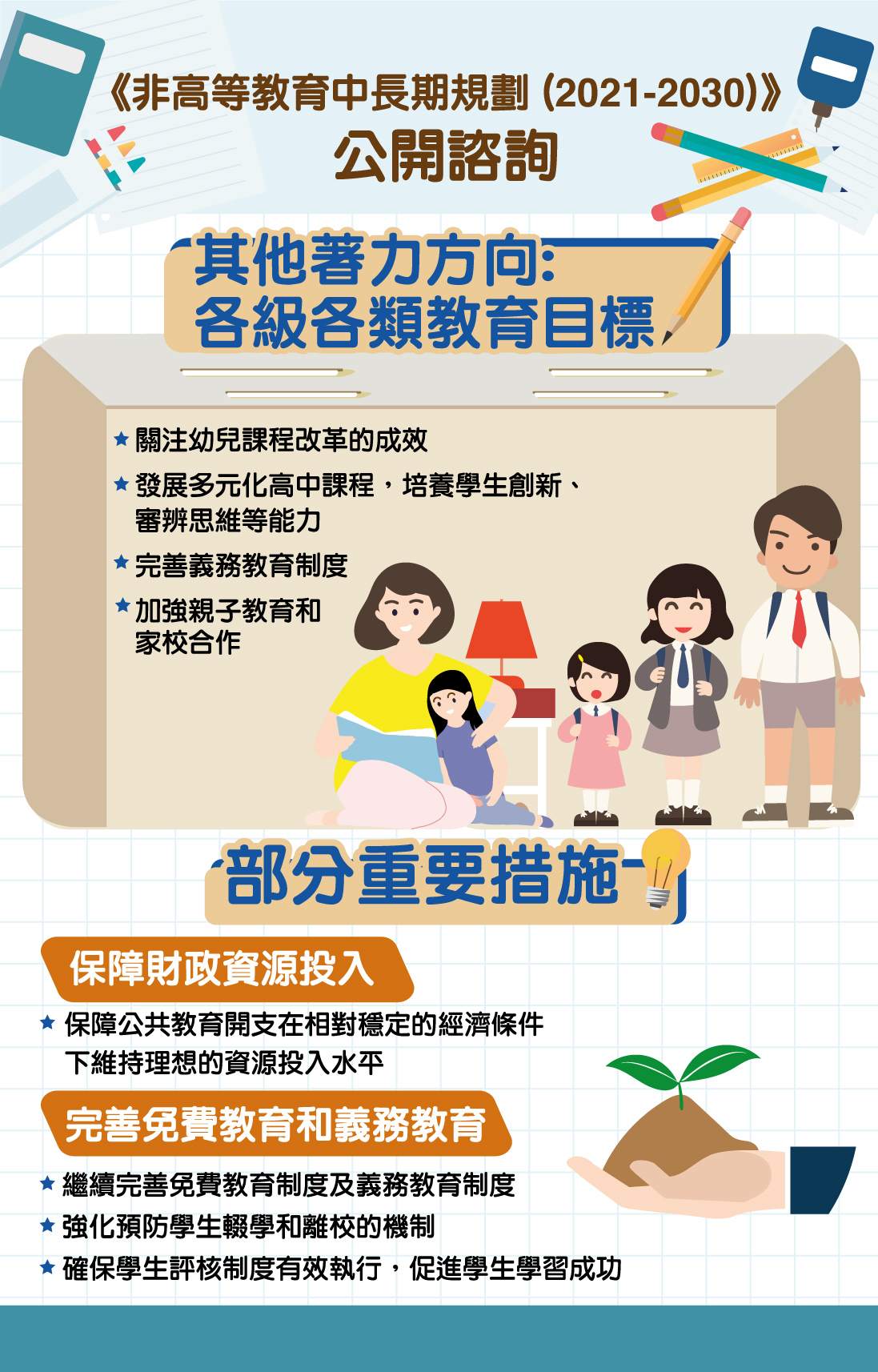 澳門特別行政區政府首個教育發展規劃《非高等教育發展十年規劃(2011-2020年)》(下稱《十年規劃》)包括了“優先發展教育”、“邁向高品質高公平教育系統”、“推動課程與教學改革”、“建設專業師資隊伍”等目標,賦予頂層設計和指導性的意義。政策實施以來,各項工作有序進行,通過社會各界努力,近年教育水平整體得到一定的提升。由於《十年規劃》接近尾聲,為長遠規劃澳門非高等教育的發展,教育暨青年局參考各地教育規劃文件和政策,總結《十年規劃》實施的經驗,並結合本地教育發展現況及未來需求,擬定了《非高等教育中長期規劃(2021-2030)》諮詢文本,並將於2020年12月5日至2021年1月22日向公眾諮詢意見。