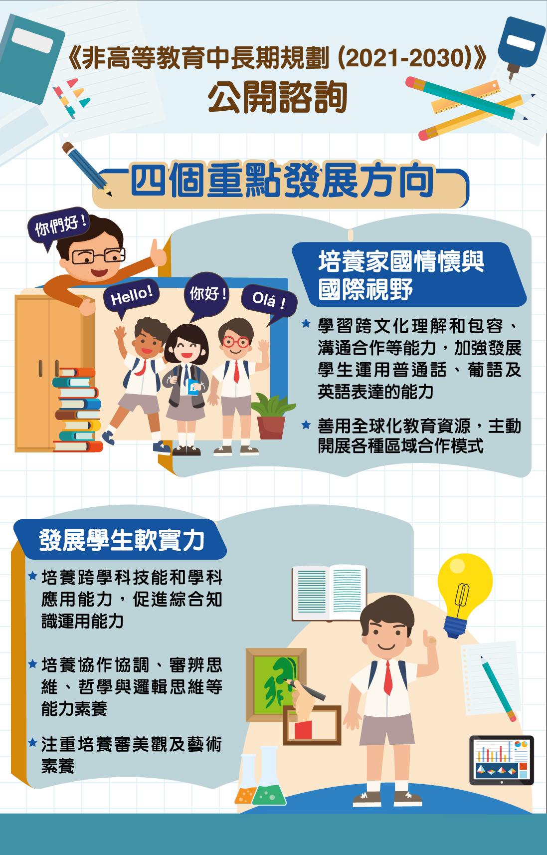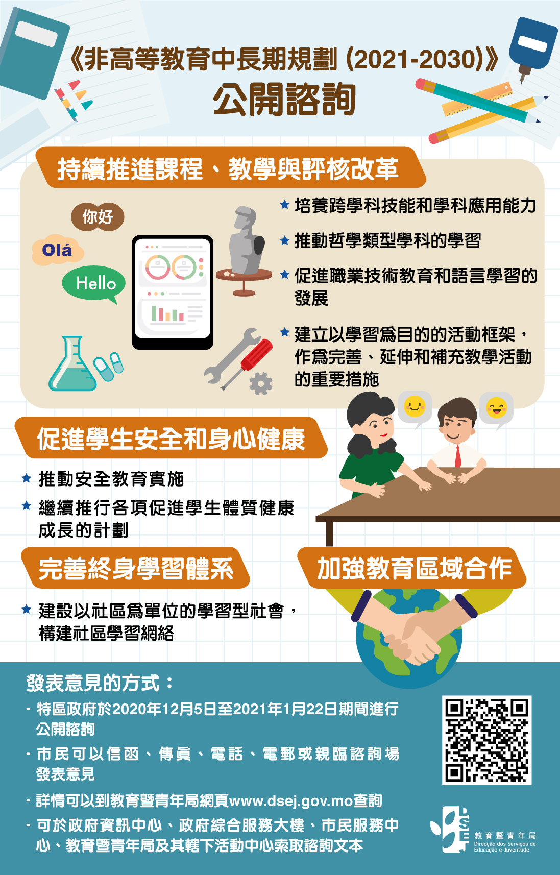 澳門特別行政區政府首個教育發展規劃《非高等教育發展十年規劃(2011-2020年)》(下稱《十年規劃》)包括了“優先發展教育”、“邁向高品質高公平教育系統”、“推動課程與教學改革”、“建設專業師資隊伍”等目標,賦予頂層設計和指導性的意義。政策實施以來,各項工作有序進行,通過社會各界努力,近年教育水平整體得到一定的提升。由於《十年規劃》接近尾聲,為長遠規劃澳門非高等教育的發展,教育暨青年局參考各地教育規劃文件和政策,總結《十年規劃》實施的經驗,並結合本地教育發展現況及未來需求,擬定了《非高等教育中長期規劃(2021-2030)》諮詢文本,並將於2020年12月5日至2021年1月22日向公眾諮詢意見。