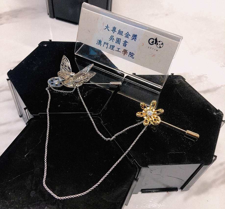 吳圓書的金獎作品運用了機械蝴蝶、齒輪、幾何和花瓣等元素,展翅的蝴蝶停留在齒輪花瓣之間,與另一邊的花形胸針互相呼應,展現蒸汽朋克的工業時代感覺,設計風格時尚。她認為,澳門理工學院跨領域藝術碩士學位課程的課程設置精巧,有助其結合自身的產品設計知識與跨領域藝術創作構思,提升整體設計效果。
