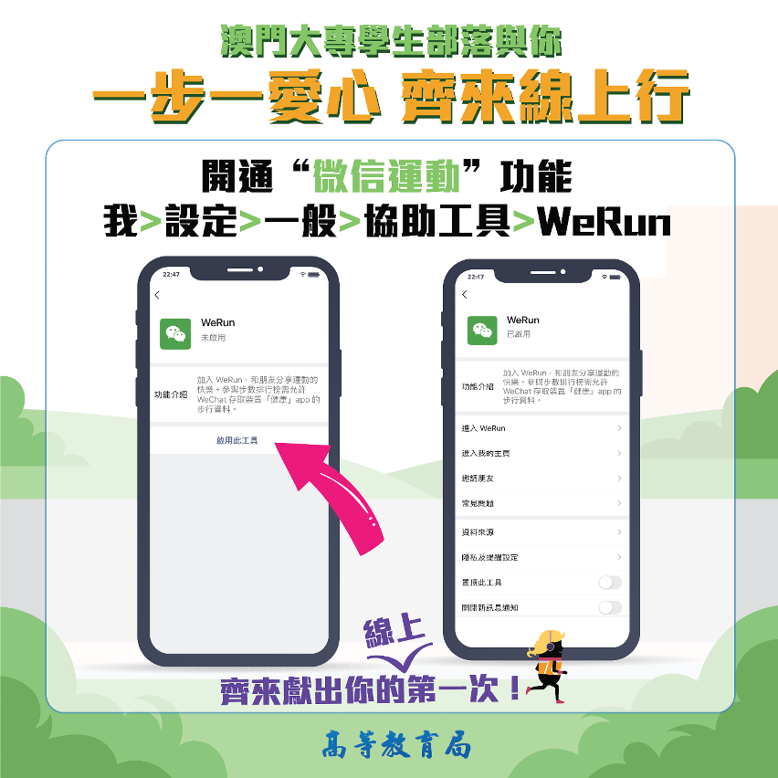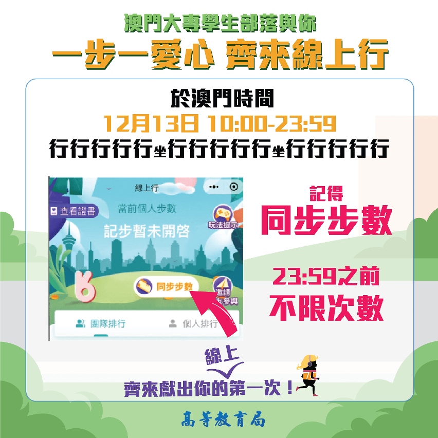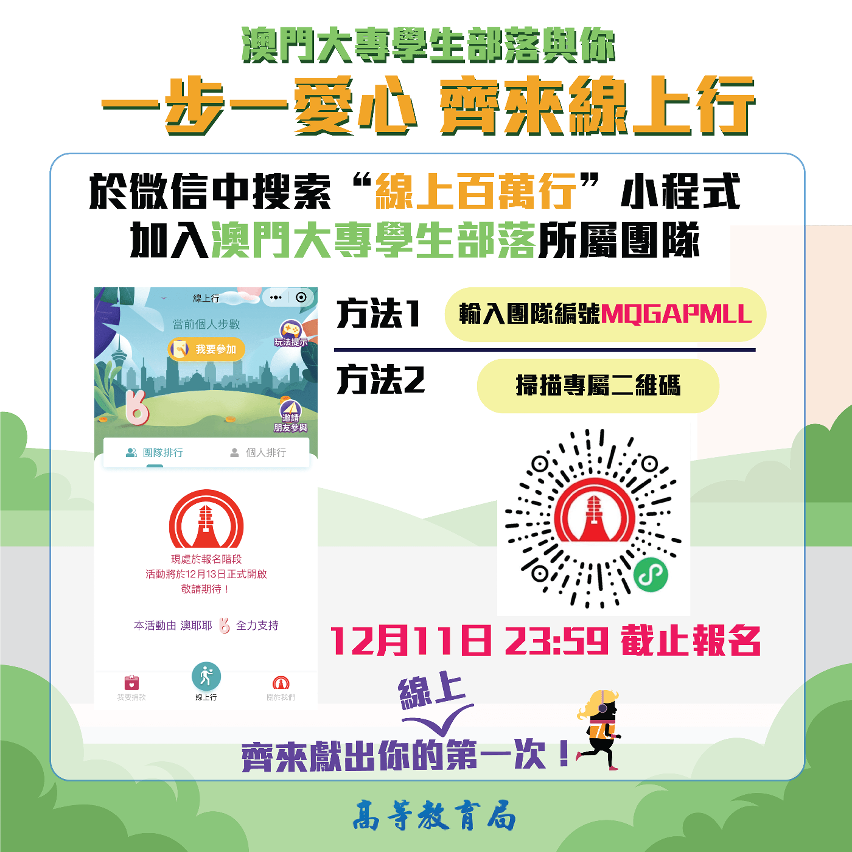 為了鼓勵更多大專學生積極參與第三十七屆公益金百萬行,高等教育局在澳門日報讀者公益基金會的協助下,已於微信“線上百萬行”小程式開通名為“澳門大專學生部落”的團隊,歡迎在本澳或外地就讀的澳門大專學生加入,捐贈“微信運動”所記錄的步數,共襄善舉。