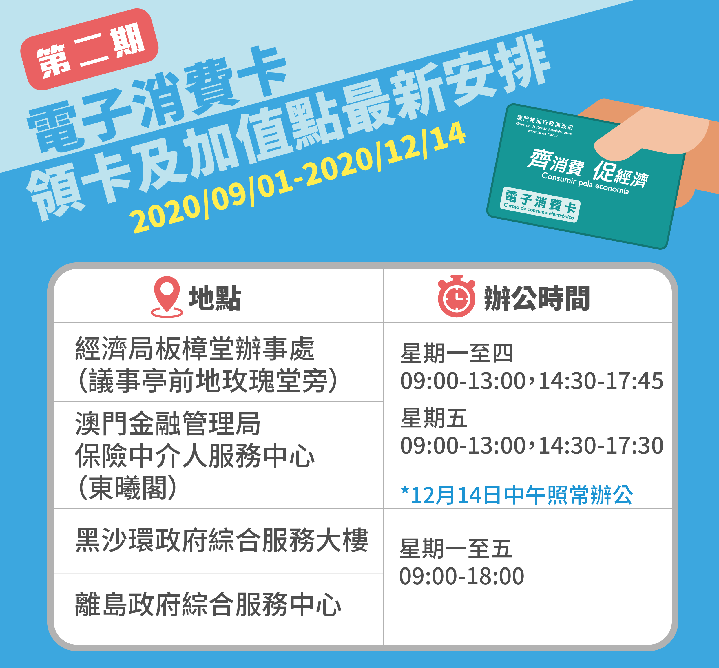 特區政府呼籲仍未領取第二期消費補貼的居民,請盡快於12月14日或之前的辦公時間內,到以下4個指定政府服務點加值或領卡: