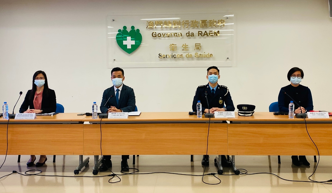 新型冠狀病毒感染應變協調中心(下稱應變協調中心)於今(14)日舉行例行記者會,仁伯爵綜合醫院羅奕龍醫務主任、治安警察局公共關係處李德輝處長、旅遊局公共關係處劉鳳池處長、疾病預防控制中心傳染病防制暨疾病監測部梁亦好協調員共同會見傳媒。
