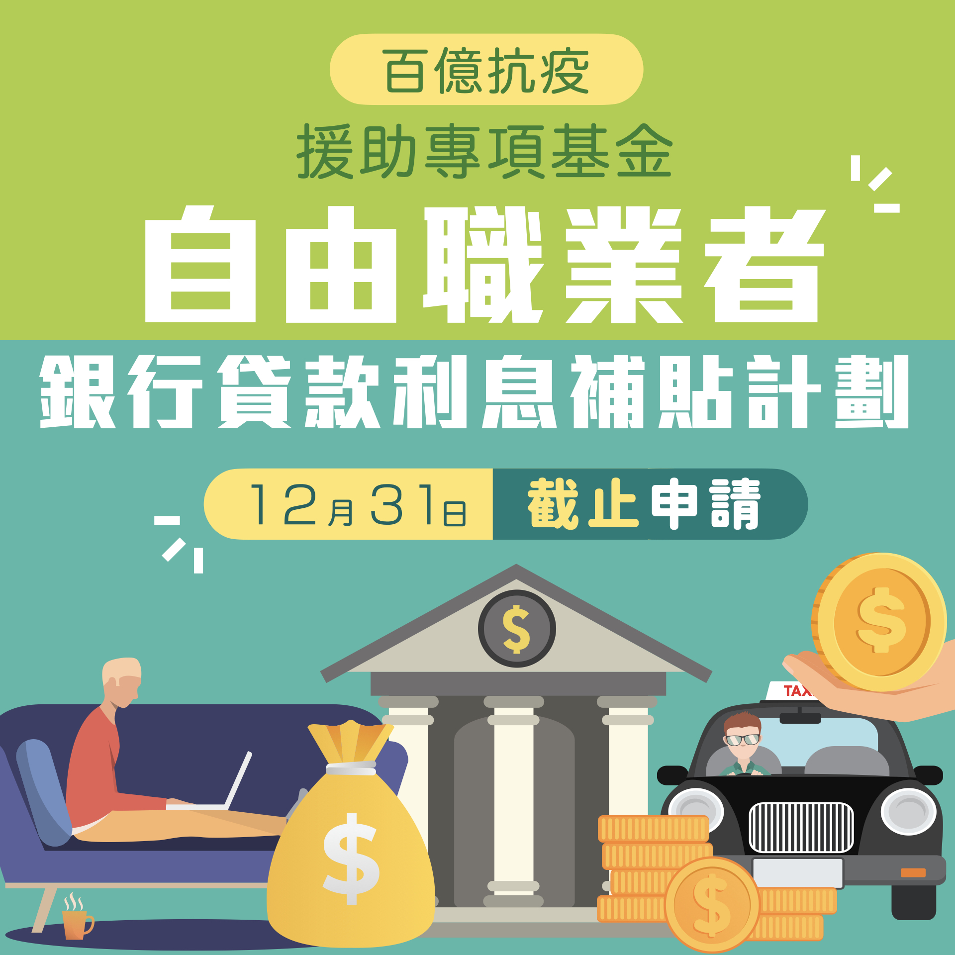 為協助自由職業者應對疫情衝擊,緩解財務壓力,特區政府於8月25日推出“自由職業者銀行貸款利息補貼計劃”。根據相關行政法規訂定,未有拖欠特區政府債務的澳門居民,於2020年2月1日至12月31日期間向澳門銀行申請並獲批的貸款,可透過貸與銀行向澳門金融管理局申請利息補貼。申請者必須於申請時,為已登記職業稅第二組納稅人,或持有交通事務局所發出的士駕駛員證且經核實從事的士客運業務;申請者只可就一筆貸款申請利息補貼,利息補貼率上限為四個百分點,補貼金額不可超過申請者實際支付的利息金額,即每宗最高補貼8,000澳門元。