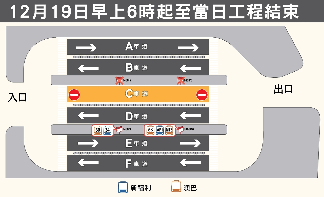 交通事務局正進行“湖畔大廈”站維修路面及更換照明系統,配合工程安排,該站12月17日至19日實施臨時交通安排,期間C車道於12月19日實施封閉交通,30、34、56、AP1及MT3路線需臨時停靠E車道供乘客上落,詳情請見下表。
