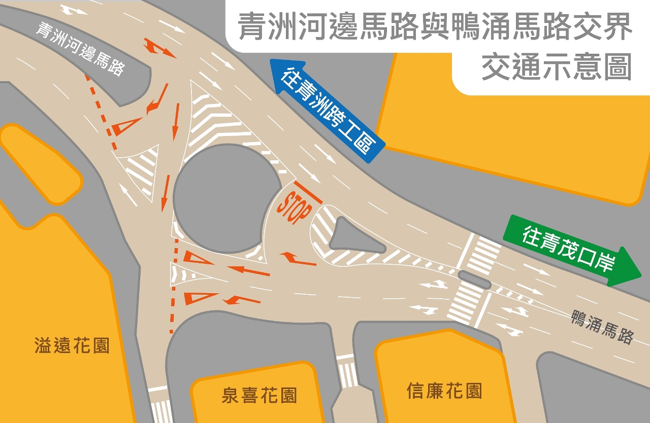 按照整治方案,調整交界路口的行車安排後,由鴨涌馬路方向之調頭車輛,無需再繞過花圃,可經由迴轉車道調頭;而由青洲跨工區進入青洲河邊馬路之車輛,亦無需再繞過花圃,可按交通標誌及標線指示直接右轉駛往溢遠花園方向或進行調頭。