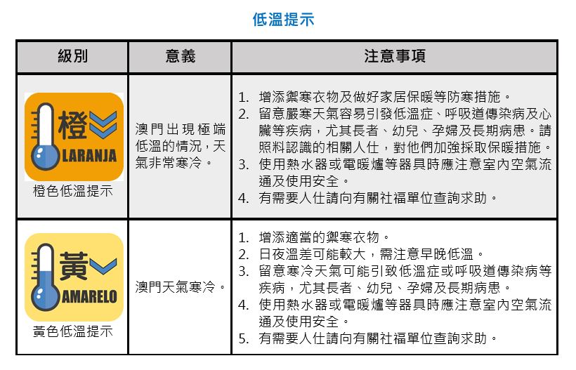 “冷暖天氣提示服務”是綜合考慮本澳出現酷熱和寒冷天氣的程度、持續時間和頻率來制定,目的在酷熱〈黃色高溫提示〉或非常酷熱〈橙色高溫提示〉天氣發生前,提早發出對應的高溫提示,提醒公眾預早做好消暑避暑措施;而當寒冷〈黃色低溫提示〉或非常寒冷〈橙色低溫提示〉天氣來襲時,提早發出提示,避免公眾因為寒冷天氣而影響健康。
